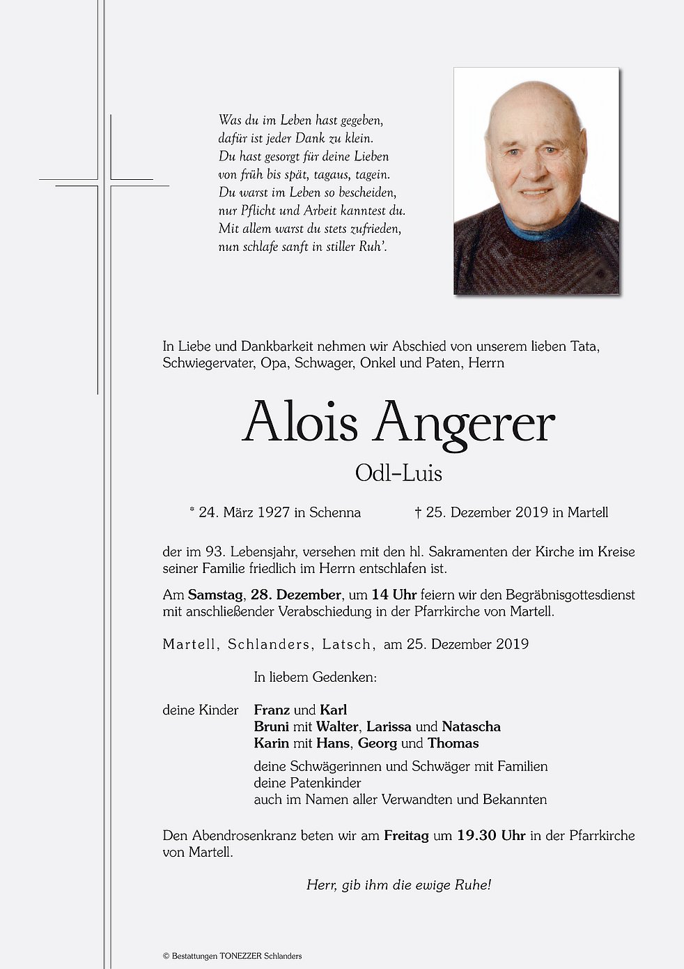 Am Samstag, 28. Dezember, um 14 Uhr feiern wir den Begräbnisgottesdienst mit anschließender Verabschiedung in der Pfarrkirche von Martell.