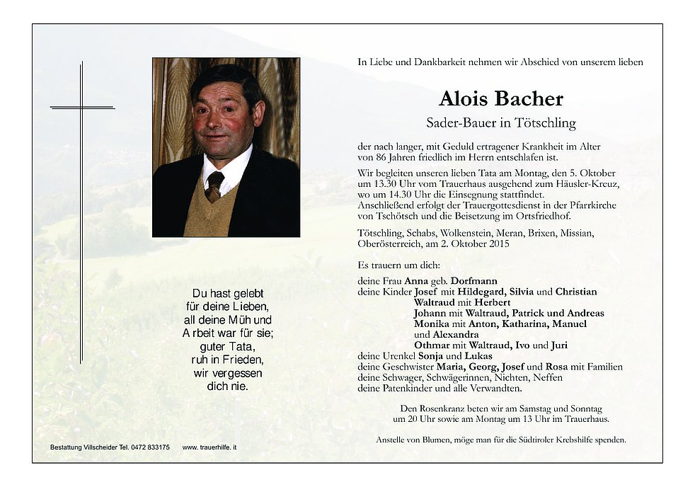 Anstelle von Blumen, möge man für die Südtiroler Krebshilfe spenden.