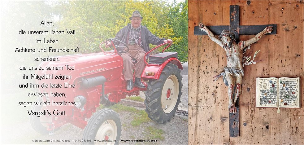 Anstelle von Blumen möge man der Südtiroler Vinzenzgemeinschaft spenden: IBAN IT52I 03493 11600 000300220230