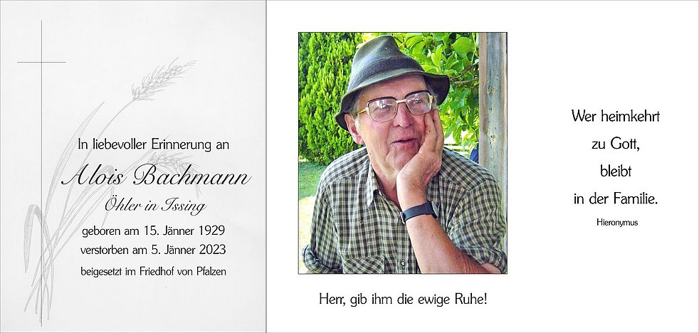 Unser Vati ist im Heimathaus aufgebahrt, ab Montagmittag in der Friedhofskapelle von Pfalzen. Den Seelenrosenkranz beten wir am Samstag und am Sonntag um 19 Uhr im Trauerhaus in Issing sowie am Montag um 19 Uhr und am Dienstag um 14 Uhr in der Pfarrkirche von Pfalzen.