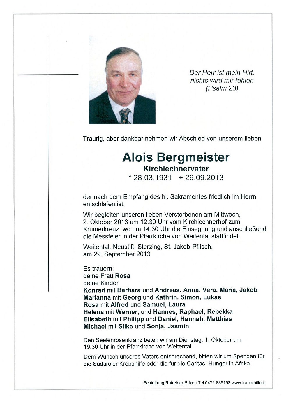 Wir begleiten unseren lieben Verstorbenen am Mittwoch, 2. Oktober 2013 um 12.30 Uhr vom Kirchlechnerhof zum Krumerkreuz, wo um 14.30 Uhr die Einsegnung und anschließend die Messfeier in der Pfarrkirche von Weitental stattfindet.