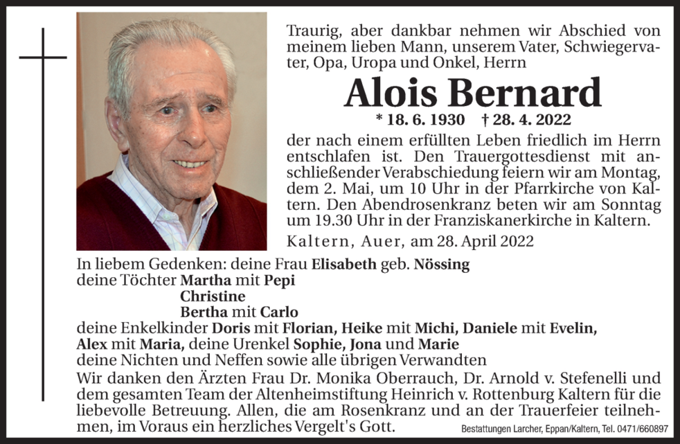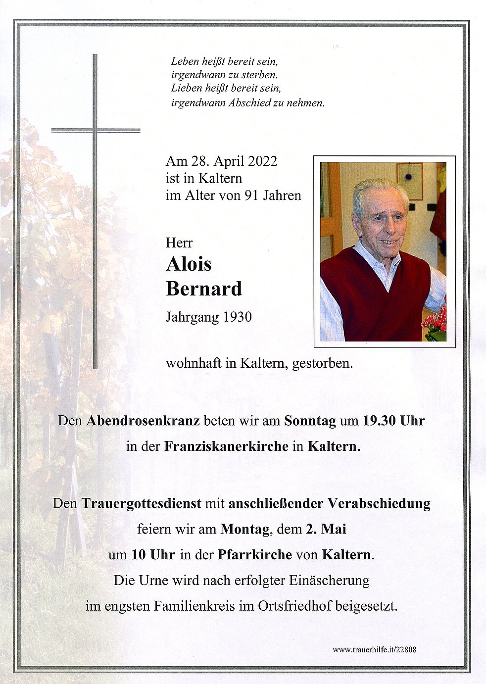 Den Trauergottesdienst mit anschließender Verabschiedung feiern wir am Montag, dem 2. Mai um 10 Uhr in der Pfarrkirche von Kaltern.