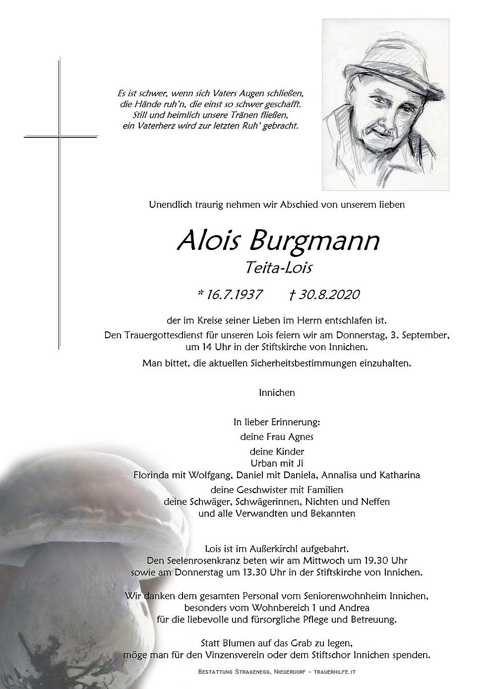 Den Trauergottesdienst für unseren Lois feiern wir am Donnerstag, 3. September, um 14 Uhr in der Stiftskirche von Innichen.