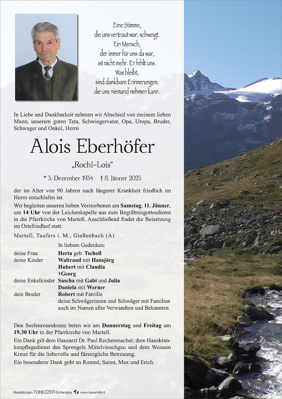 Begräbnisgottesdienst: 11.01. - 14:00 Uhr Pfarrkirche Martell