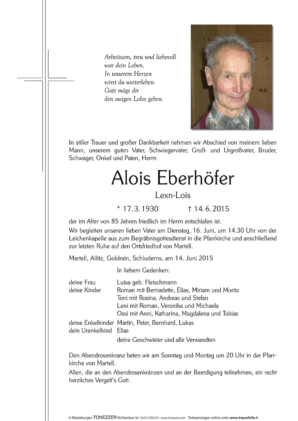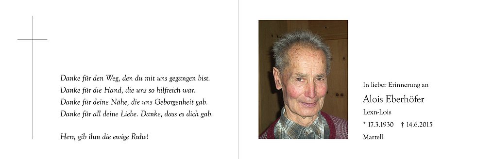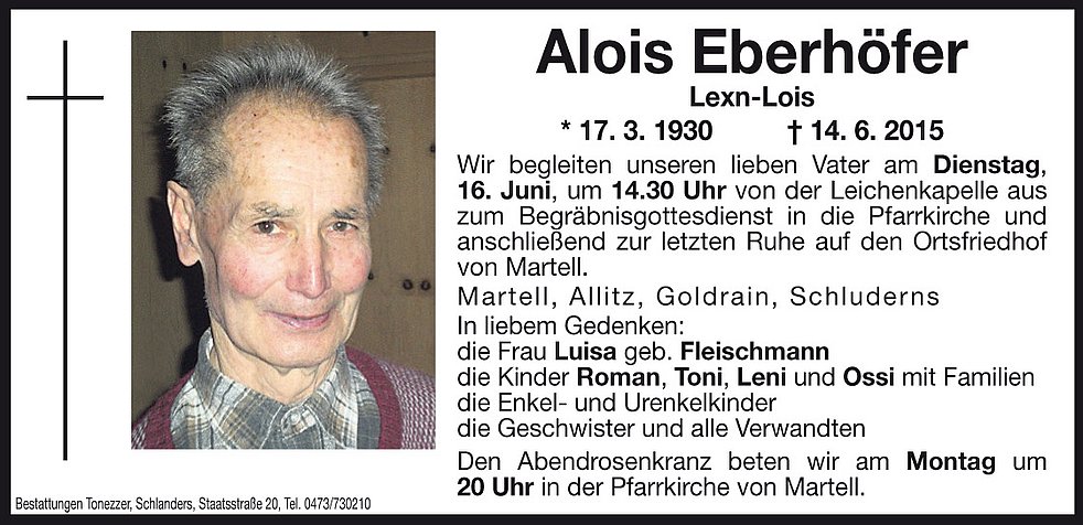 Wir begleiten unseren lieben Vater am Dienstag, 16. Juni, um 14.30 Uhr von der Leichenkapelle aus zum Begräbnisgottesdienst in die Pfarrkirche und anschließend zur letzten Ruhe auf den Ortsfriedhof von Martell.