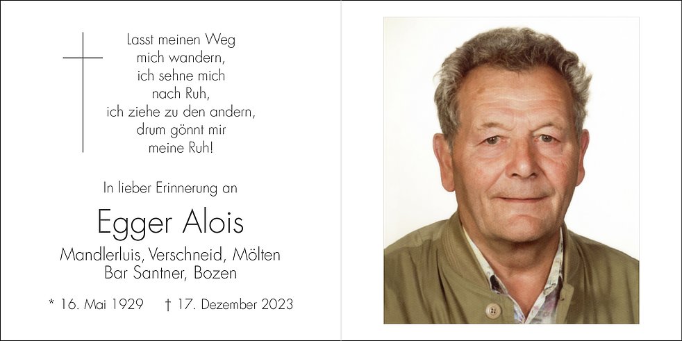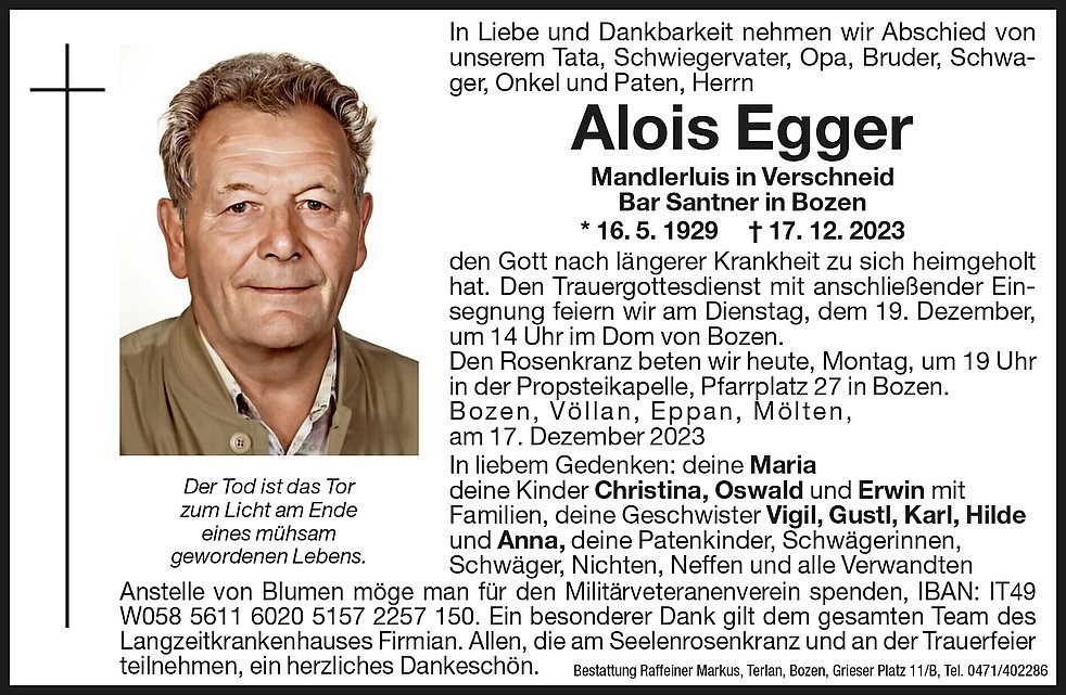 Anstelle von Blumen möge man für den Militärveteranenverein spenden. IBAN: IT49 W058 5611 6020 5157 2257 150