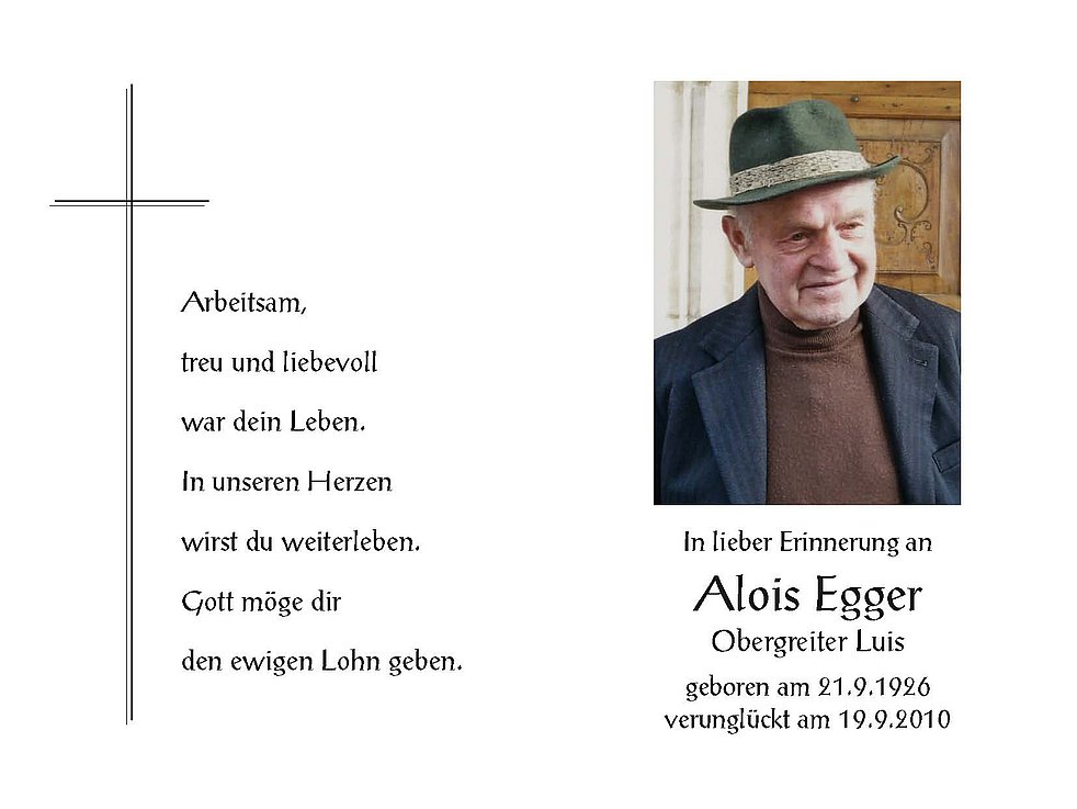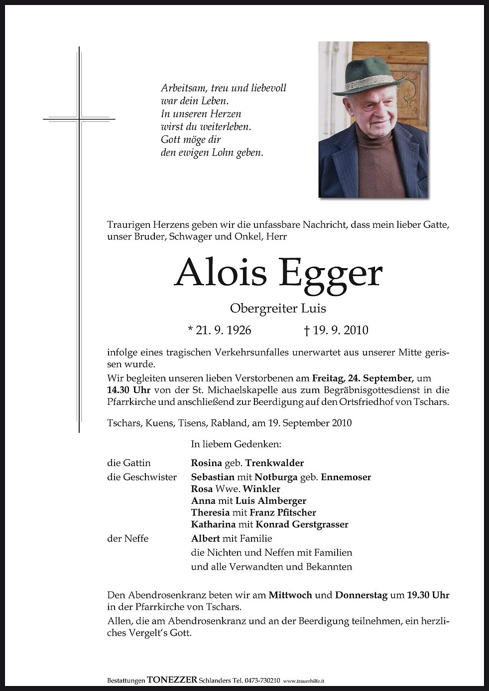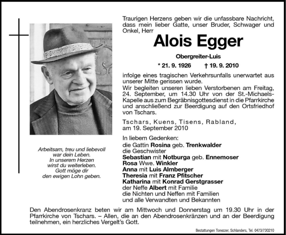 Wir begleiten unseren lieben Verstorbenen am Freitag, 24. September, um 14.30 Uhr von der St. Michaelskapelle aus zum Begräbnisgottesdienst in die Pfarrkirche und anschließend zur Beerdigung auf den Ortsfriedhof von Tschars.