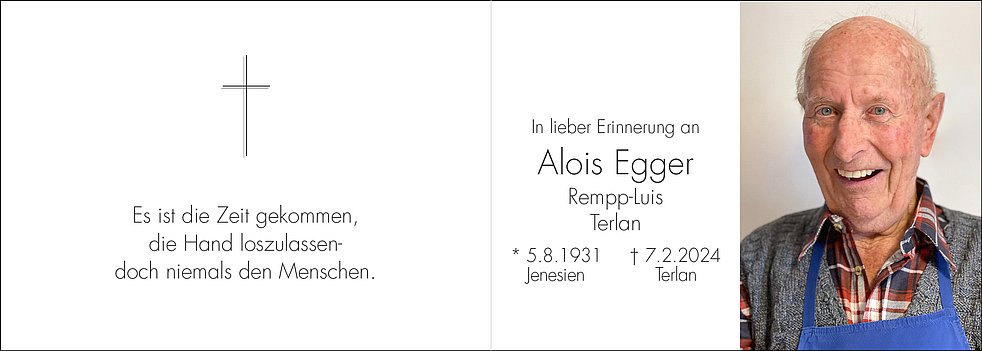 Den Trauergottesdienst feiern wir am Samstag, dem 10. Februar, um 10.30 Uhr in der Pfarrkirche von Terlan. Anschließend begleiten wir unseren lieben Luis zur letzten Ruhe in den Ortsfriedhof.