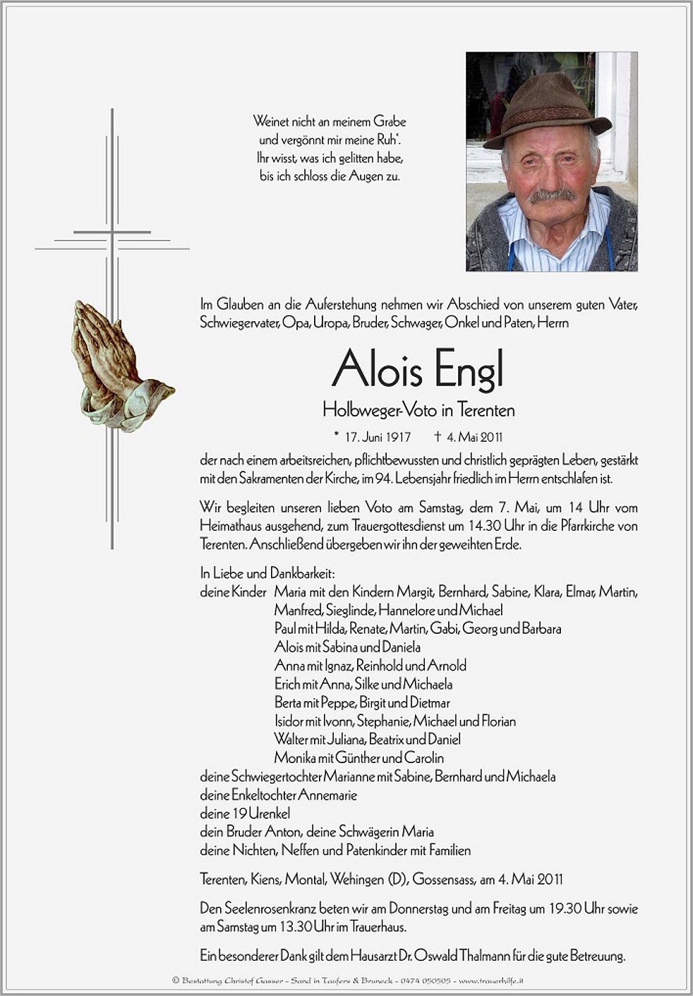 Wir begleiten unseren lieben Voto am Samstag, dem 7. Mai, um 14 Uhr vom Heimathaus ausgehend, zum Trauergottesdienst um 14.30 Uhr in die Pfarrkirche von Terenten. Anschließend übergeben wir ihn der geweihten Erde.