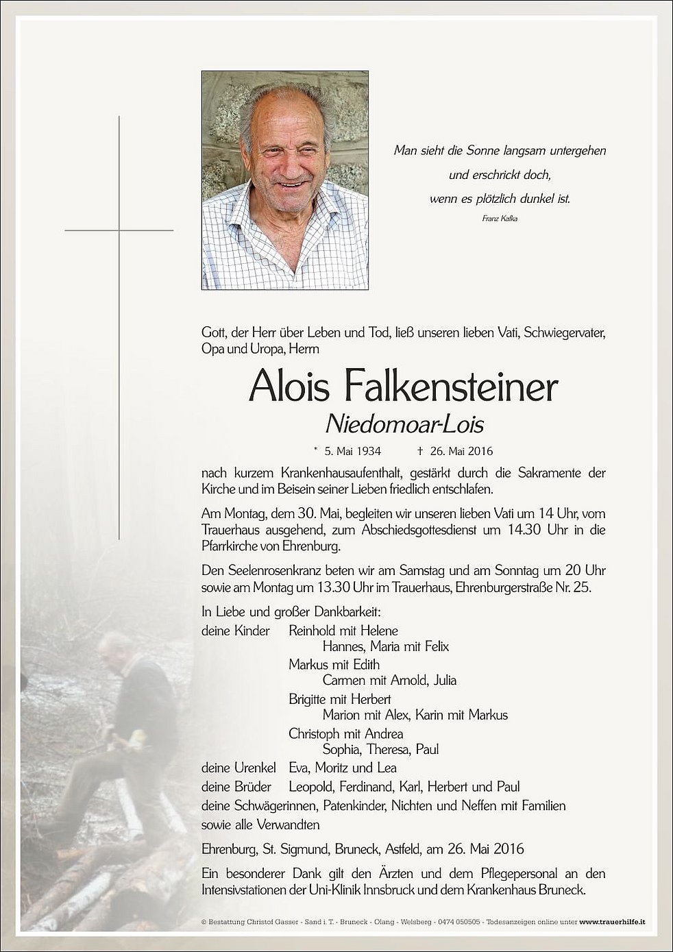 Am Montag, dem 30. Mai, begleiten wir unseren lieben Vati um 14 Uhr, vom Trauerhaus ausgehend, zum Abschiedsgottesdienst um 14.30 Uhr in die Pfarrkirche von Ehrenburg.