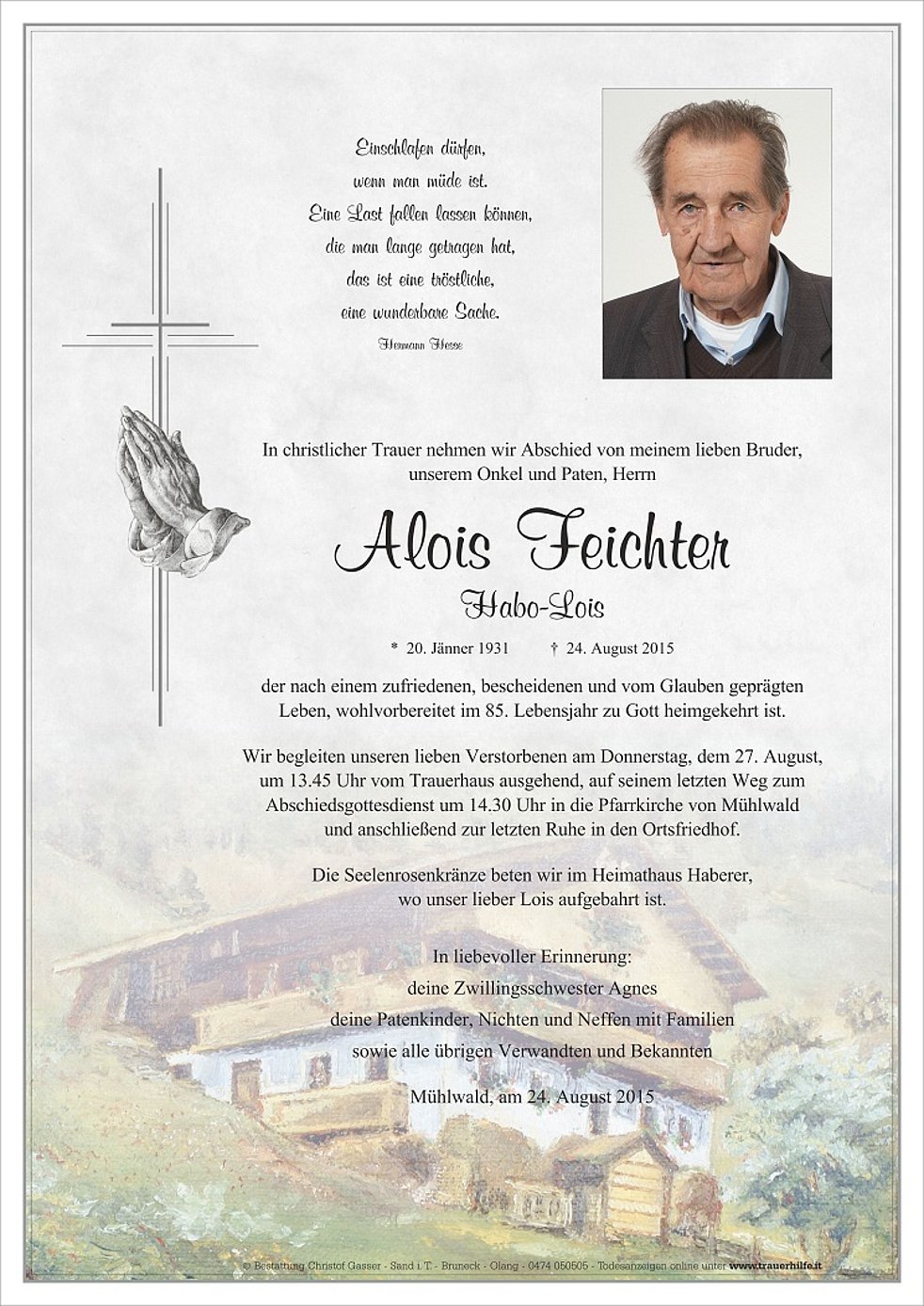 um 13.45 Uhr vom Trauerhaus ausgehend, auf seinem letzten Weg zum Abschiedsgottesdienst um 14.30 Uhr in die Pfarrkirche von Mühlwald