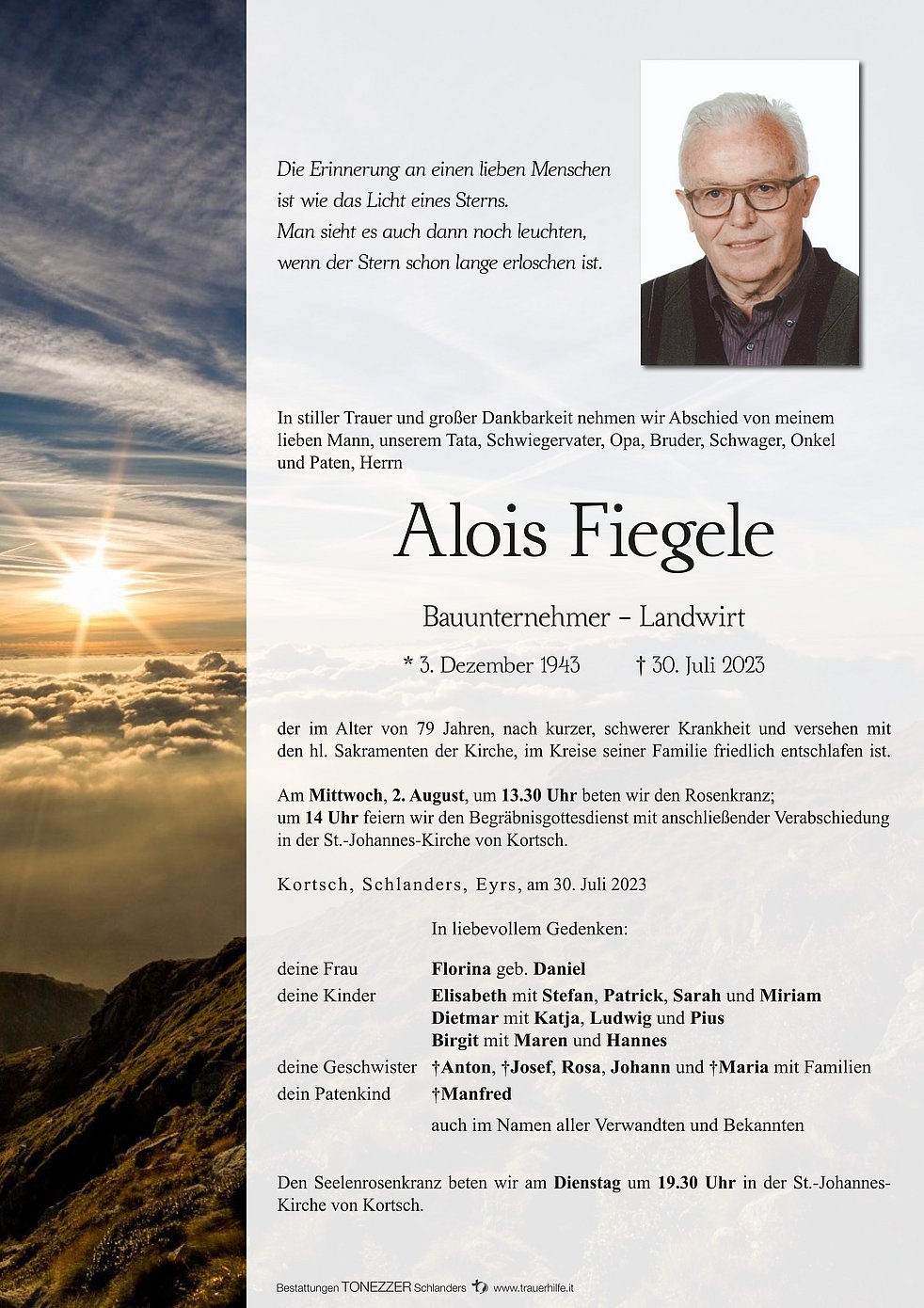 der im Alter von 79 Jahren, nach kurzer, schwerer Krankheit und versehen mit den hl. Sakramenten der Kirche, im Kreise seiner Familie friedlich entschlafen ist.