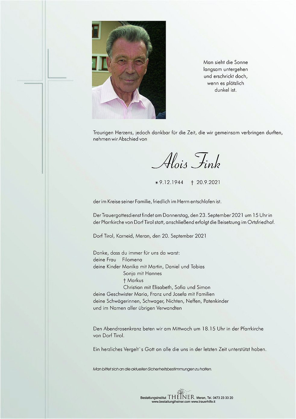 Der Trauergottesdienst findet am Donnerstag, den 23. September 2021 um 15 Uhr in der Pfarrkirche von Dorf Tirol statt, anschließend erfolgt die Beisetzung im Ortsfriedhof.