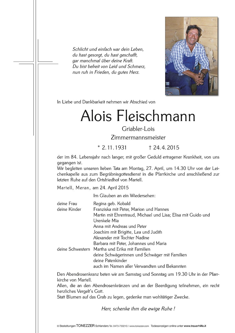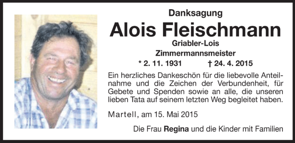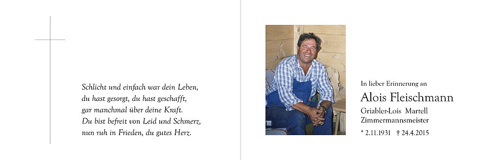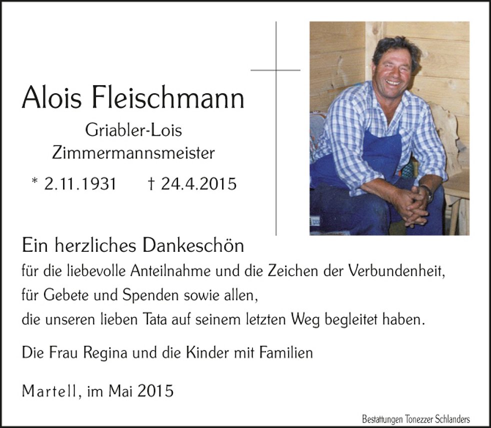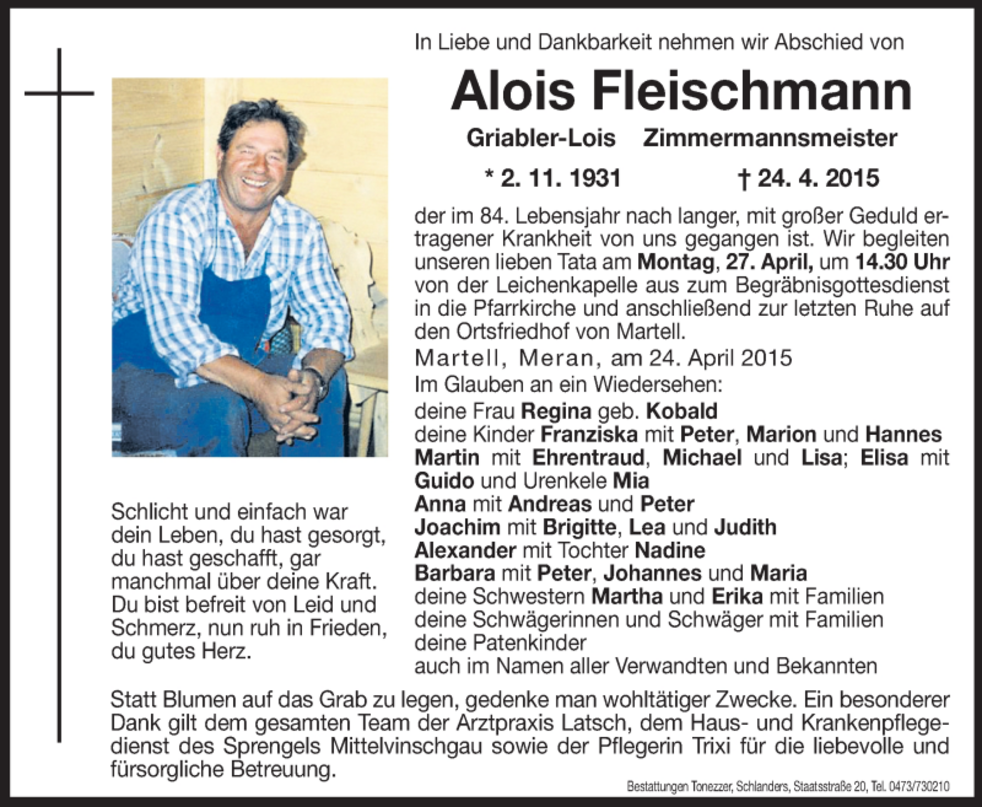Wir begleiten unseren lieben Tata am Montag, 27. April, um 14.30 Uhr von der Leichenkapelle aus zum Begräbnisgottesdienst in die Pfarrkirche und anschließend zur letzten Ruhe auf den Ortsfriedhof von Martell.
