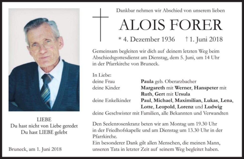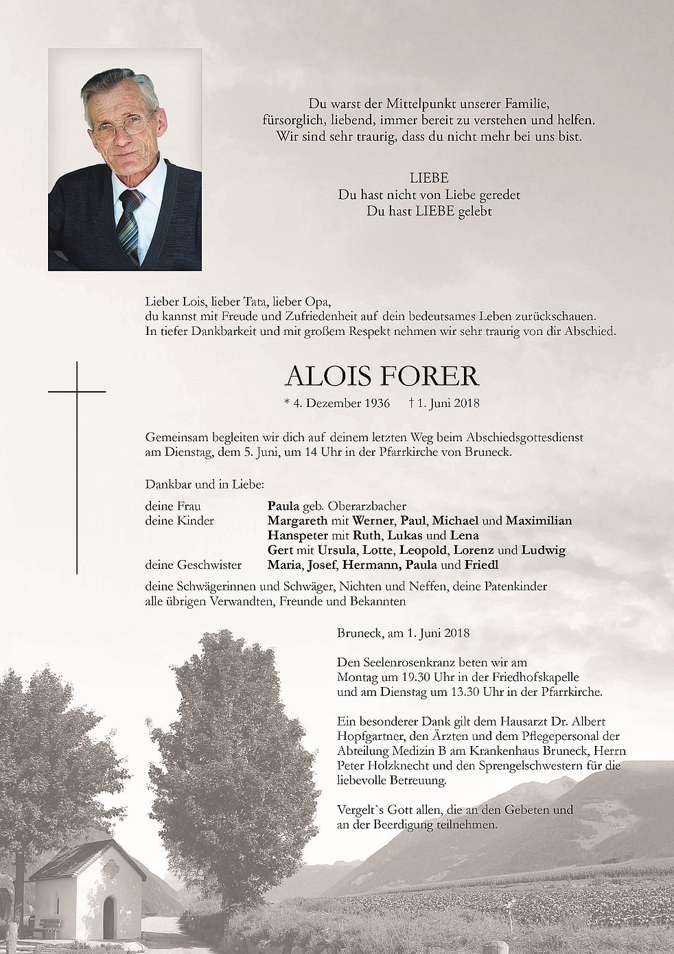Ein besonderer Dank gilt dem Hausarzt Dr. Albert Hopfgartner, den Ärzten und dem Pflegepersonal der Abteilung Medizin B am Krankenhaus Bruneck, Herrn Peter Holzknecht und den Sprengelschwestern für die liebevolle Betreuung.