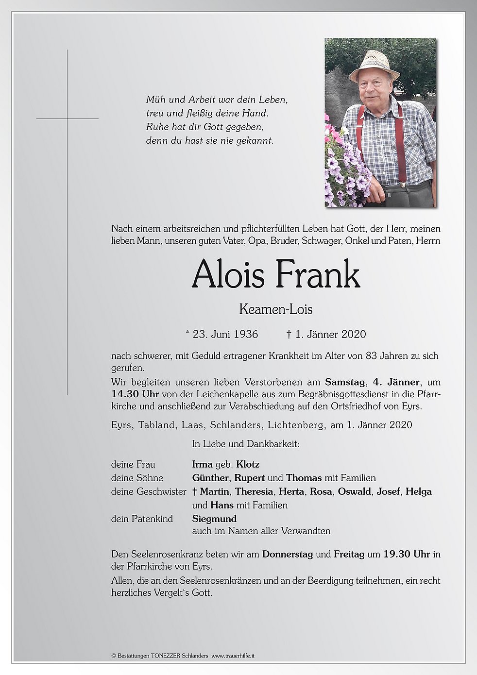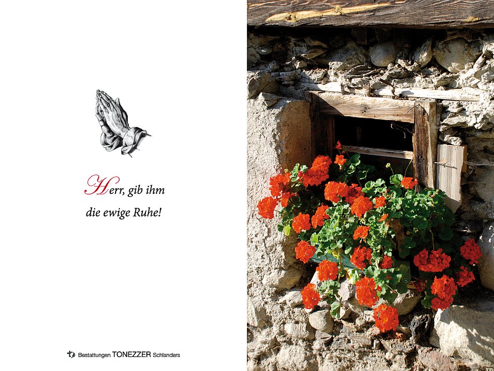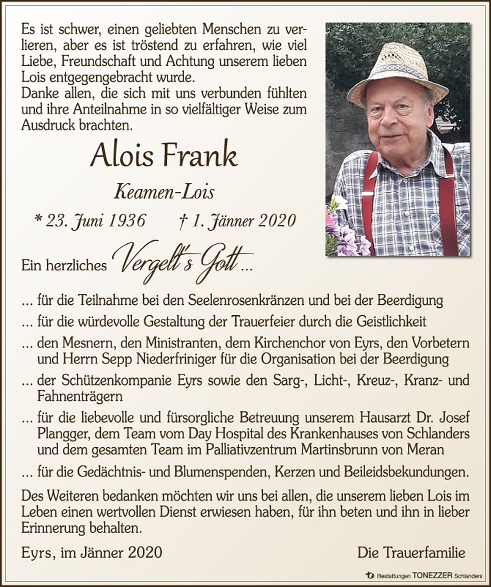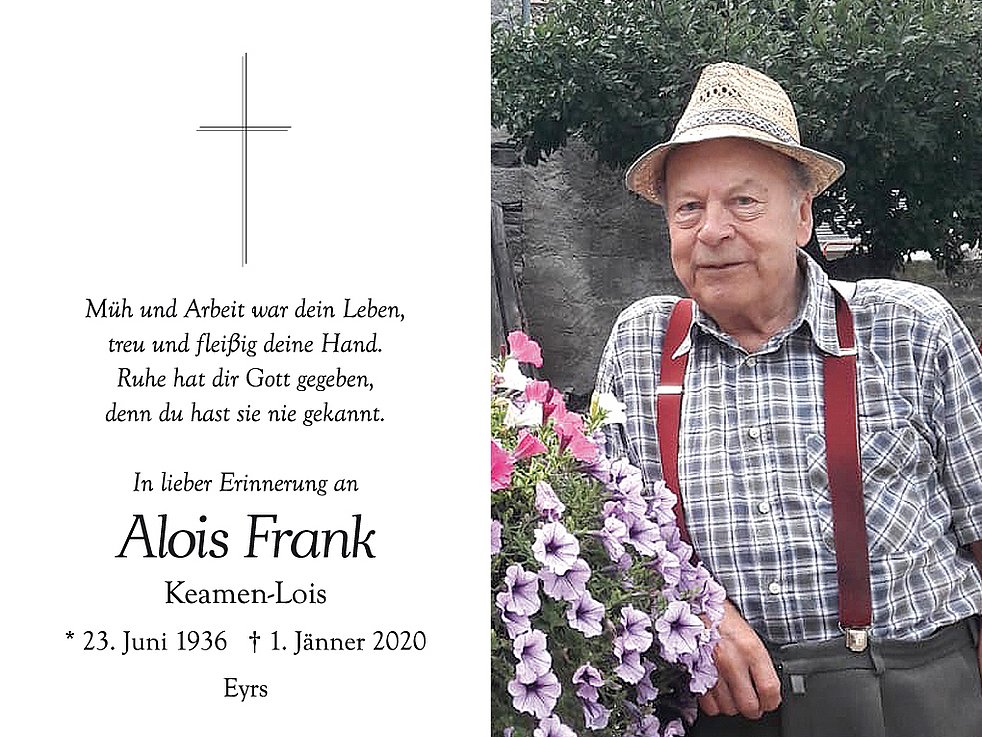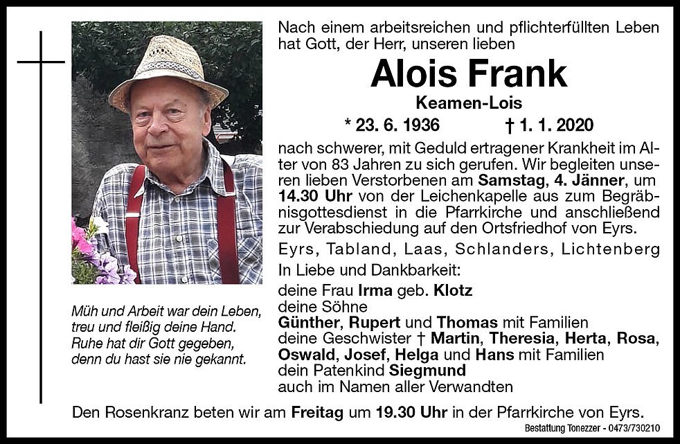 Wir begleiten unseren lieben Verstorbenen am Samstag, 4. Jänner, um 14.30 Uhr von der Leichenkapelle aus zum Begräbnisgottesdienst in die Pfarrkirche und anschließend zur Verabschiedung auf den Ortsfriedhof von Eyrs.