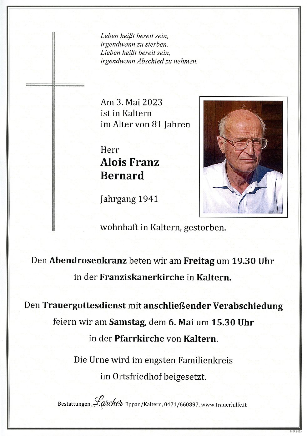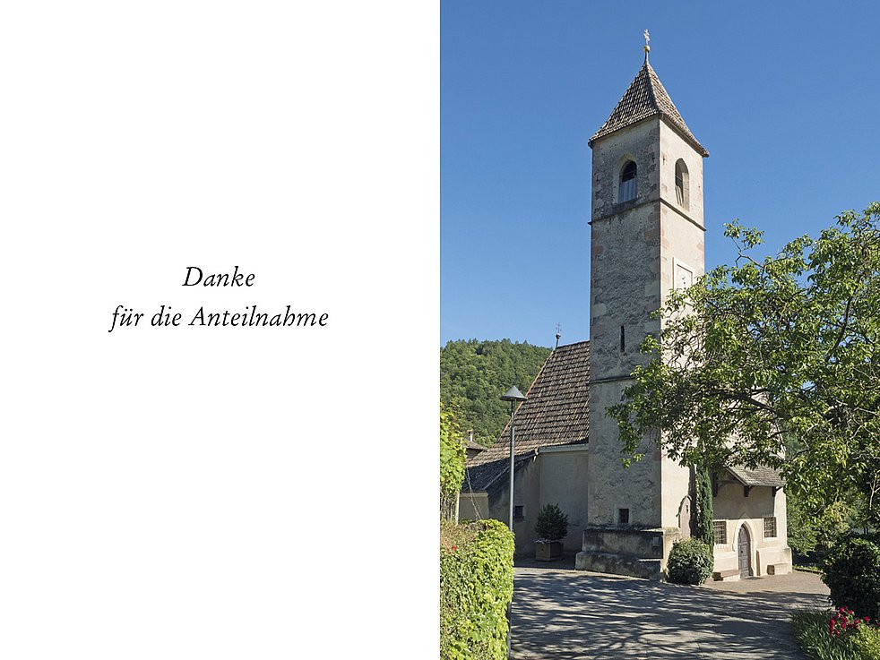 Den Trauergottesdienst mit anschließender Verabschiedung feiern wir am Samstag, dem 6. Mai um 15.30 Uhr in der Pfarrkirche von Kaltern.