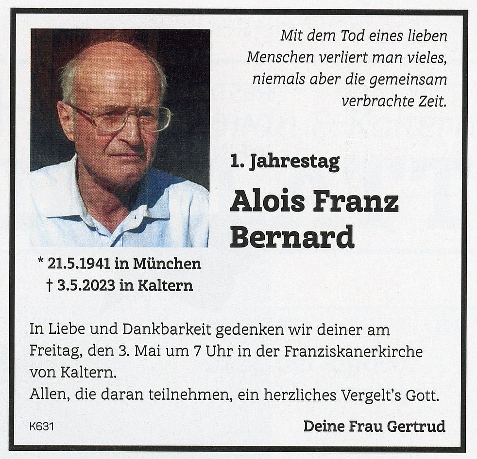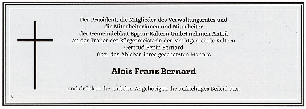 Im Sinne des Verstorbenen möge man für die Pfarrkirche Kaltern IBAN IT34 H 08255 58250 000302002574 und für die Krebshilfe Überetsch IBAN IT 22 O 08220 58371 000304202317 spenden.