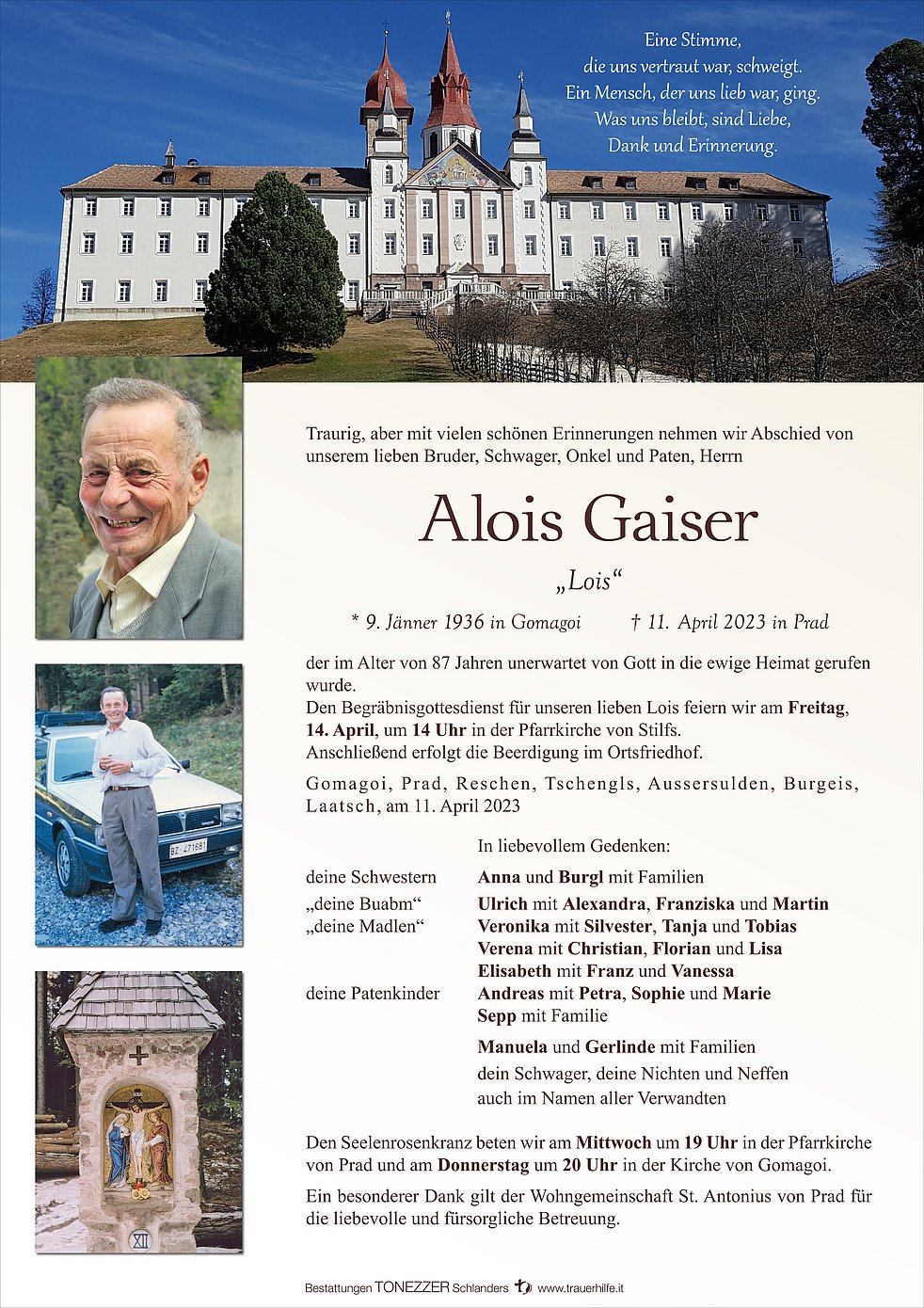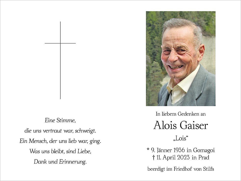 Den Begräbnisgottesdienst für unseren lieben Lois feiern wir am Freitag, 14. April, um 14 Uhr in der Pfarrkirche von Stilfs.
