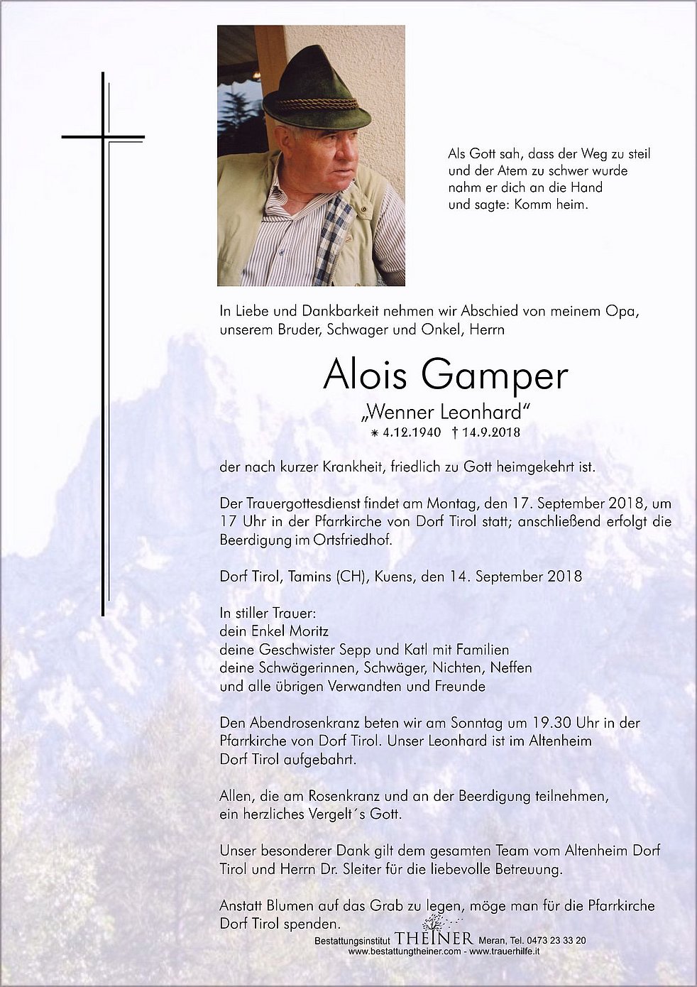 Den Abendrosenkranz beten wir am Sonntag um 19.30 Uhr in der Pfarrkirche von Dorf Tirol. Unser Leonhard ist im Altenheim Dorf Tirol aufgebahrt.