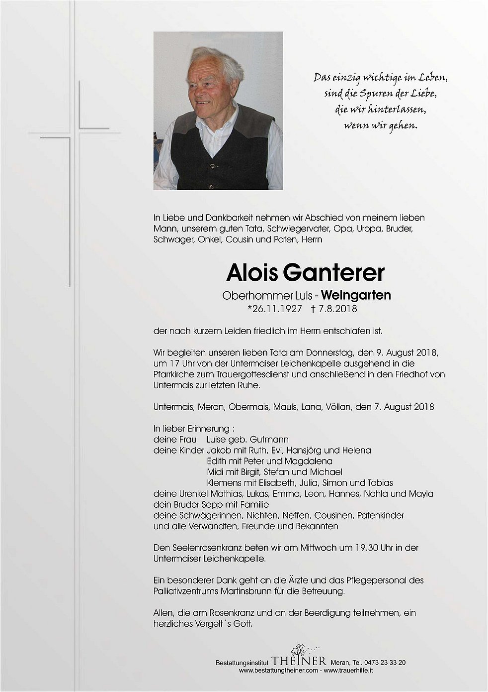 Wir begleiten unseren lieben Tata am Donnerstag, den 9. August 2018, um 17 Uhr von der Untermaiser Leichenkapelle ausgehend in die Pfarrkirche zum Trauergottesdienst und anschließend in den Friedhof von Untermais zur letzten Ruhe.