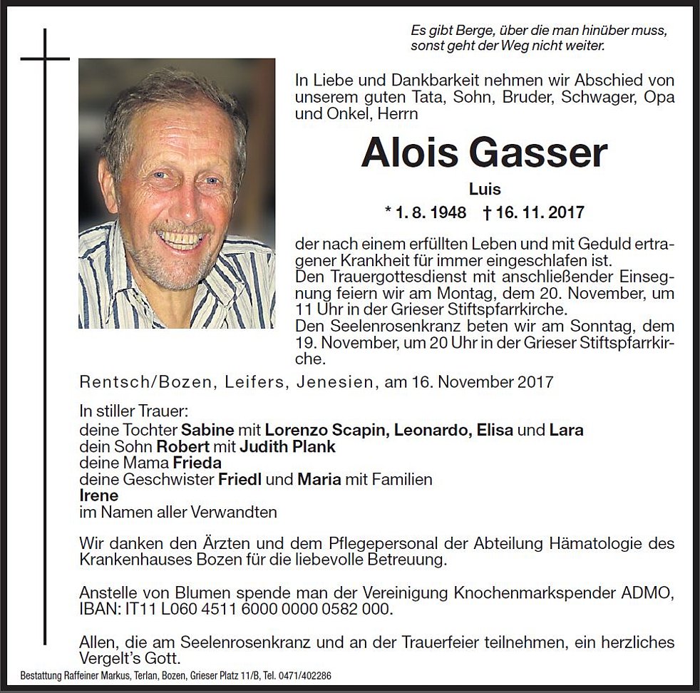 Den Trauergottesdienst mit anschließender Einsegnung feiern wir am Montag, dem 20. November, um 11 Uhr in der Grieser Stiftspfarrkirche.