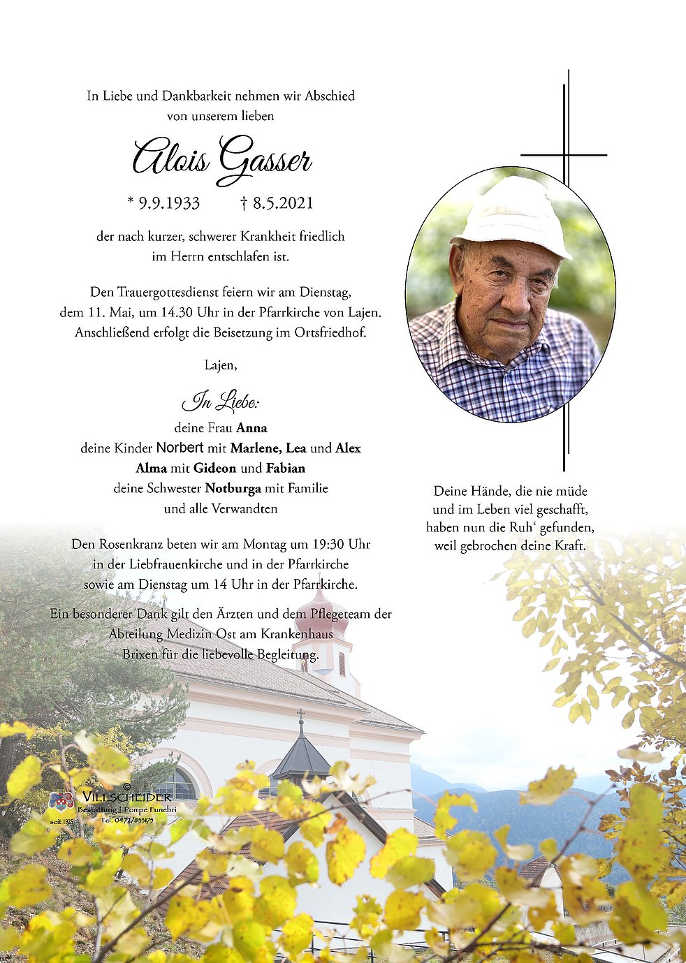 Unser herzlichstes Beileid; wir und alle damaligen Arbeitskollegen der Fa. Prinoth Schneefahrzeuge werden Alois in guter Erinnerung behalten. Unser Mitgefühl gehört dir Anna und deinen Lieben. Alma und Norbert mit Familien. Vinzenz und Marisa