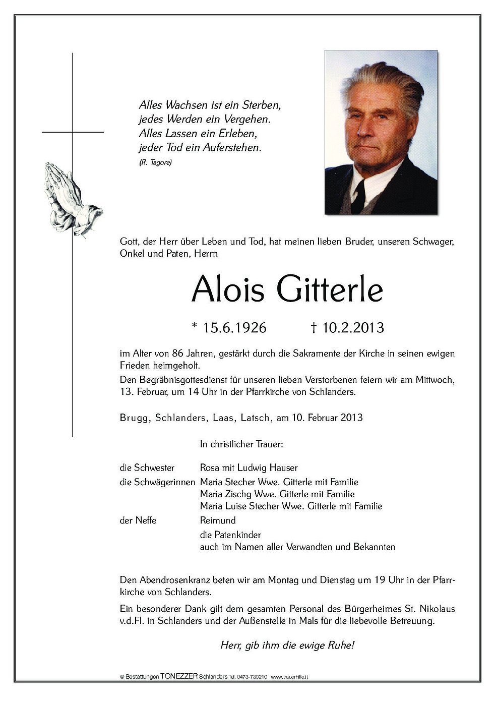 Den Begräbnisgottesdienst für unseren lieben Verstorbenen feiern wir am Mittwoch, 13. Februar, um 14 Uhr in der Pfarrkirche von Schlanders.