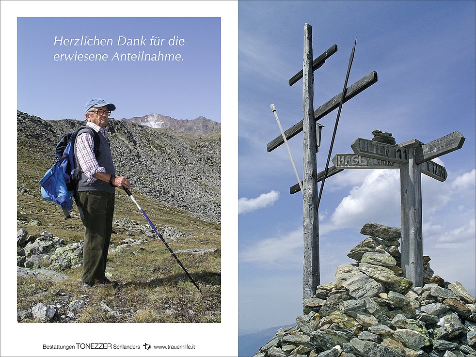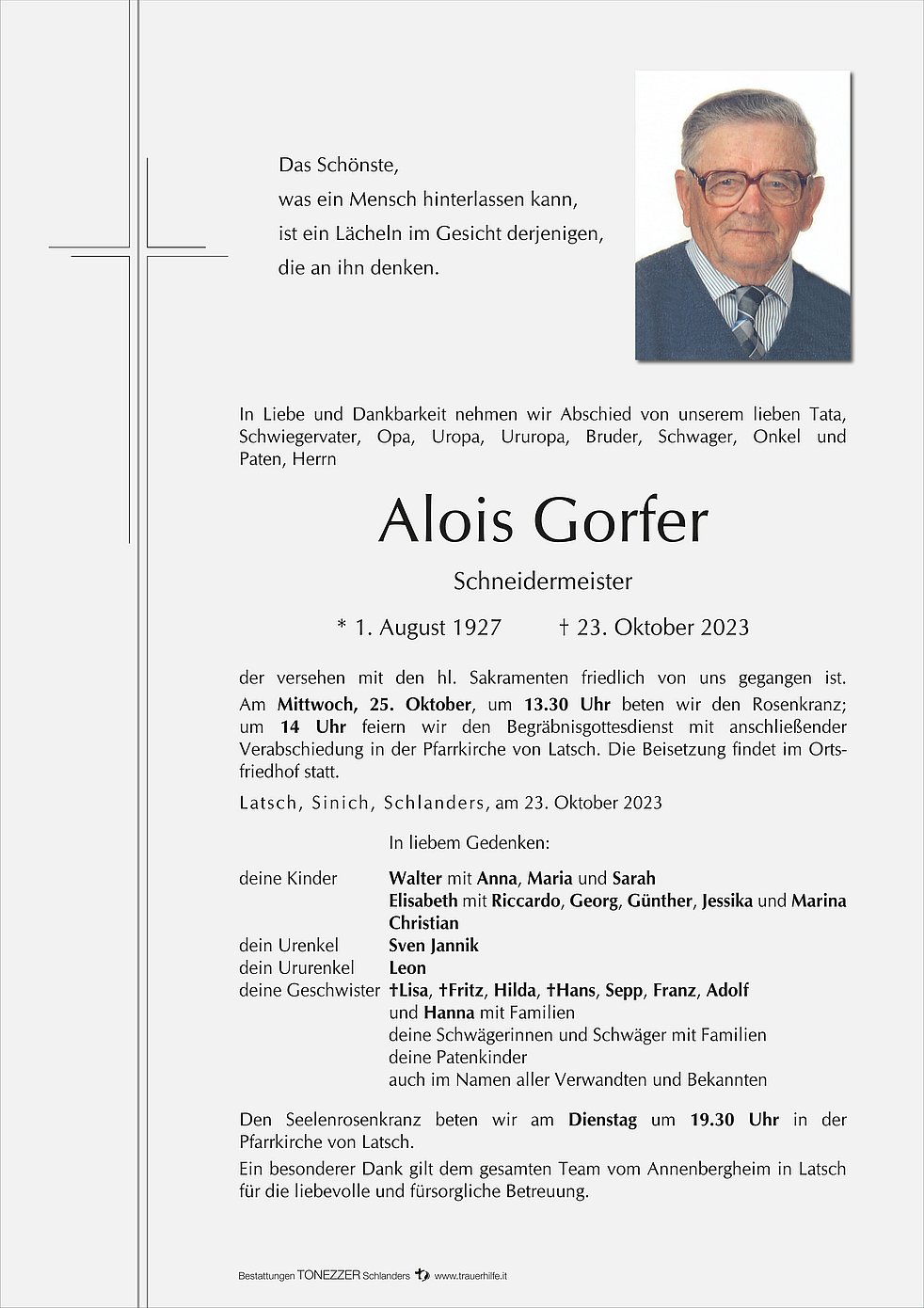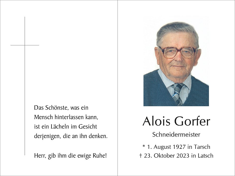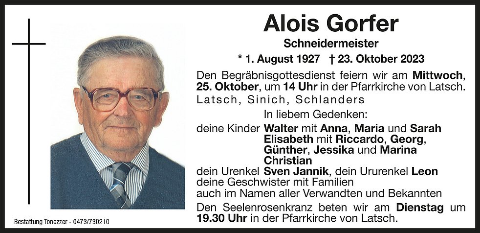 Am Mittwoch, 25. Oktober, um 13.30 Uhr beten wir den Rosenkranz; um 14 Uhr feiern wir den Begräbnisgottesdienst mit anschließender Verabschiedung in der Pfarrkirche von Latsch. Die Beisetzung findet im Ortsfriedhof statt.