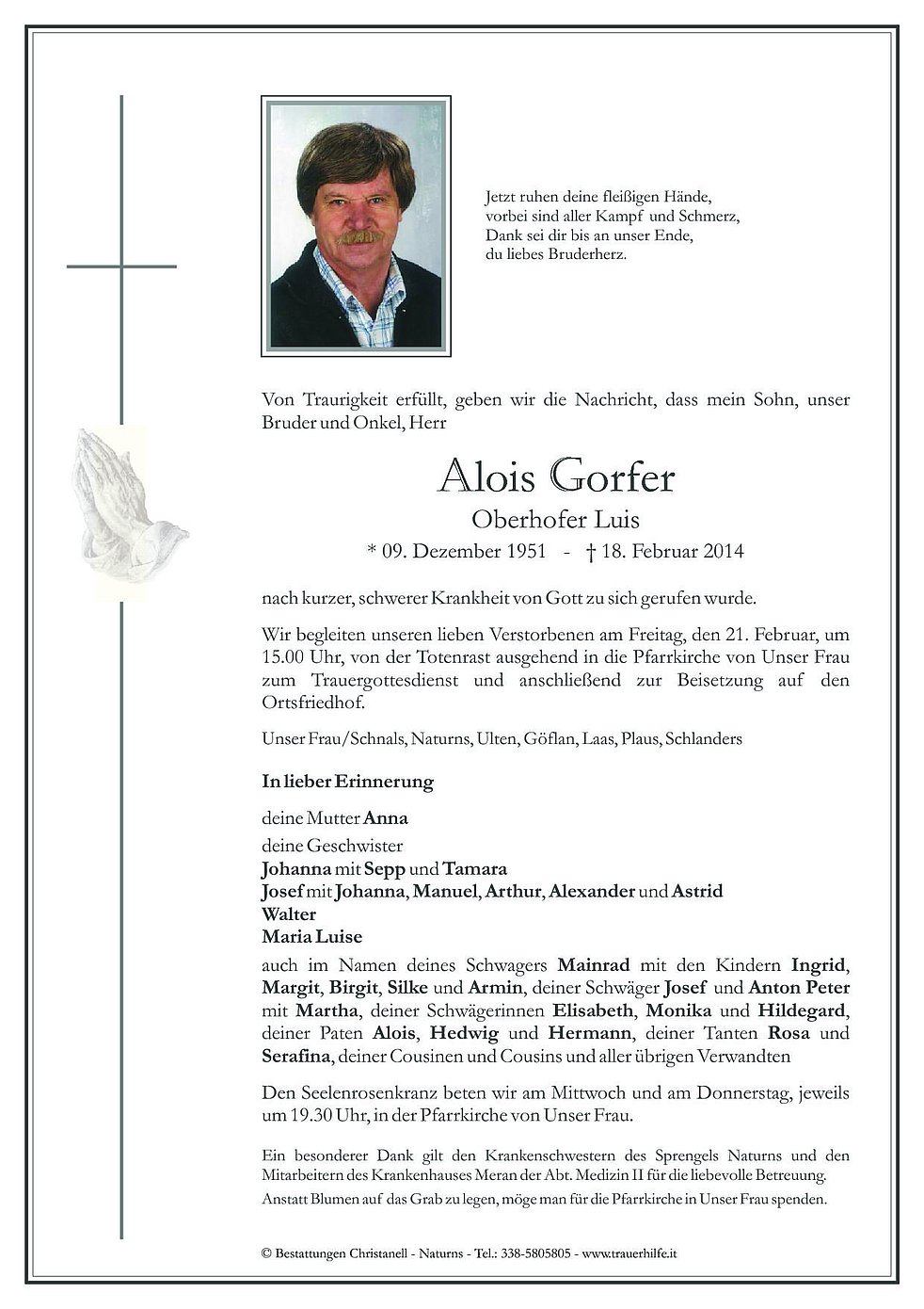 Wir begleiten unseren lieben Verstorbenen am Freitag, den 21. Februar, um 15.00 Uhr, von der Totenrast ausgehend in die Pfarrkirche von Unser Frau zum Trauergottesdienst und anschließend zur Beisetzung auf den Ortsfriedhof.