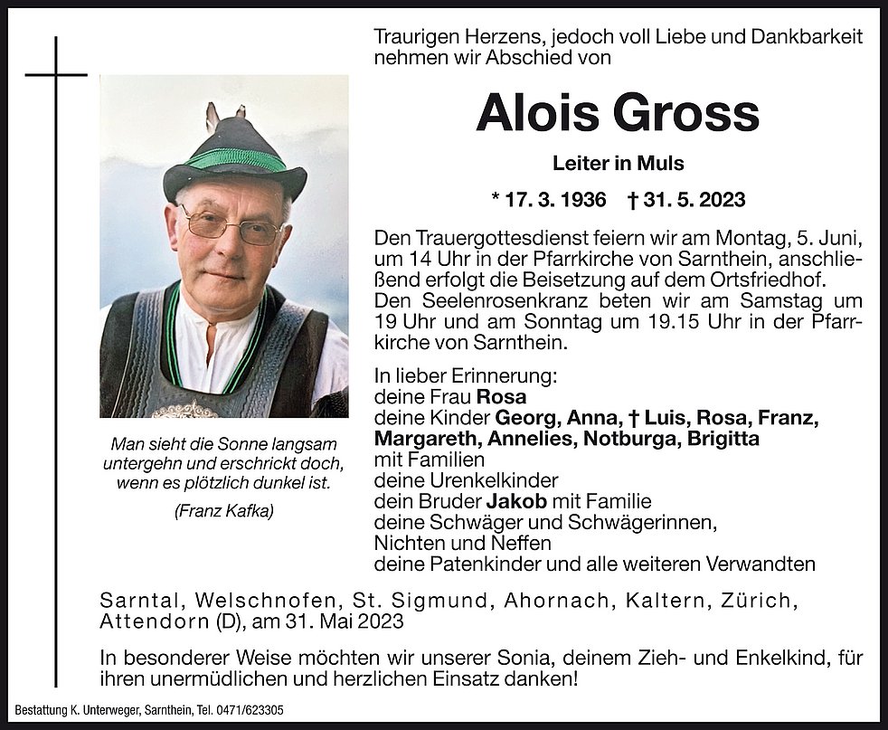 Den Trauergottesdienst feiern wir am Montag, 5. Juni, um 14 Uhr in der Pfarrkirche von Sarnthein,