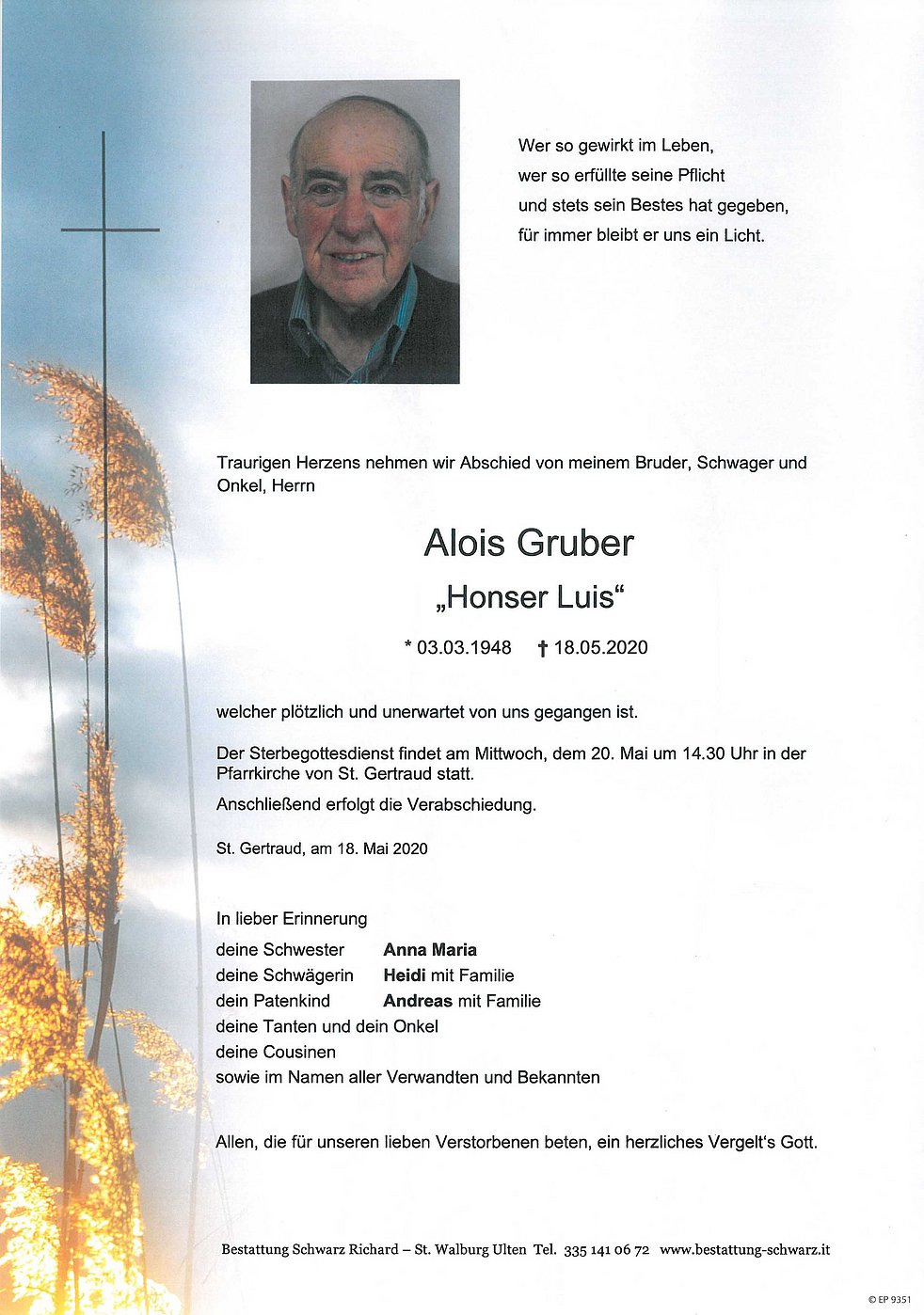 Verabschiedung: 20.05. - 14:30 Uhr St. Gertraud / Ulten