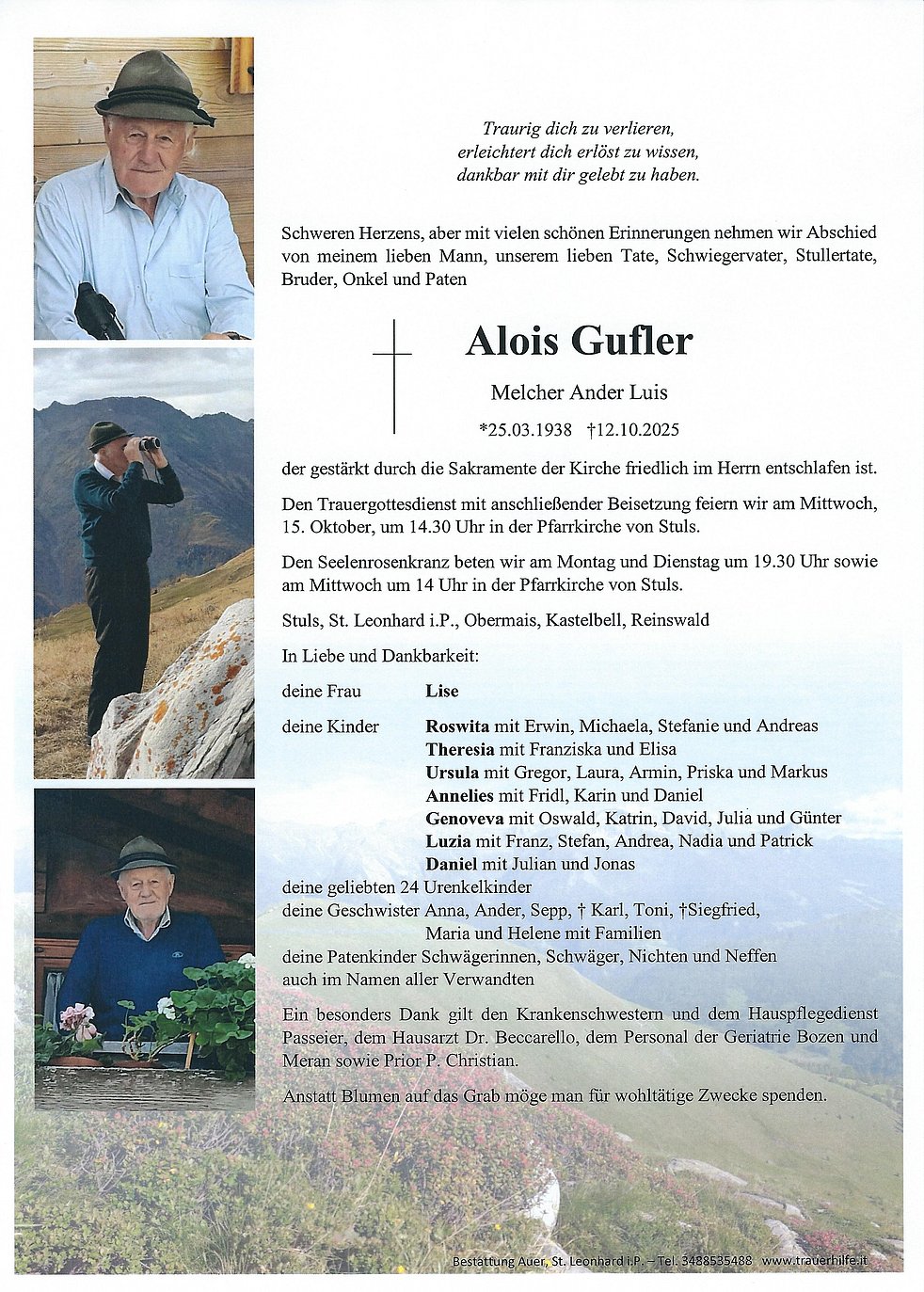 Den Trauergottesdienst mit anschließender Beisetzung feiern wir am Mittwoch, 15. Oktober, um 14.30 Uhr in der Pfarrkirche von Stuls.