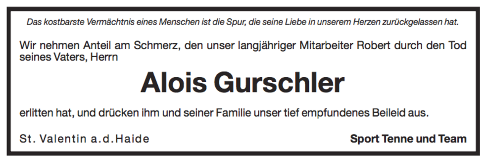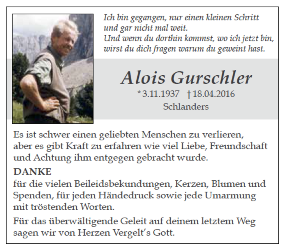 Ein besonderer Dank gilt unserem Hausarzt Dr. Hansjörg Gluderer, sowie dem gesamten Personal des Bürgerheimes St. Nikolaus v. d. Flüe für die liebevolle und fürsorgliche Betreuung.