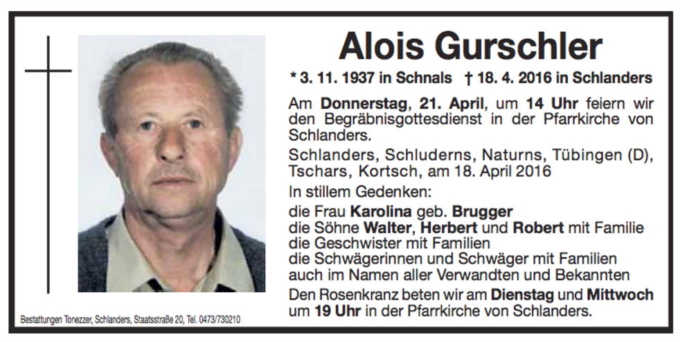 Am Donnerstag, 21. April, um 14 Uhr feiern wir den Begräbnisgottesdienst in der Pfarrkirche von Schlanders.