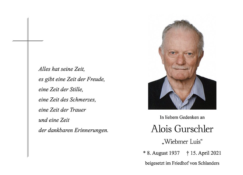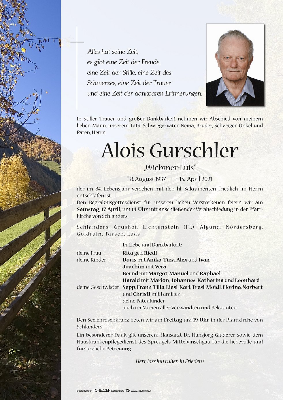 Den Begräbnisgottesdienst für unseren lieben Verstorbenen feiern wir am Samstag, 17. April, um 14 Uhr mit anschließender Verabschiedung in der Pfarrkirche von Schlanders.