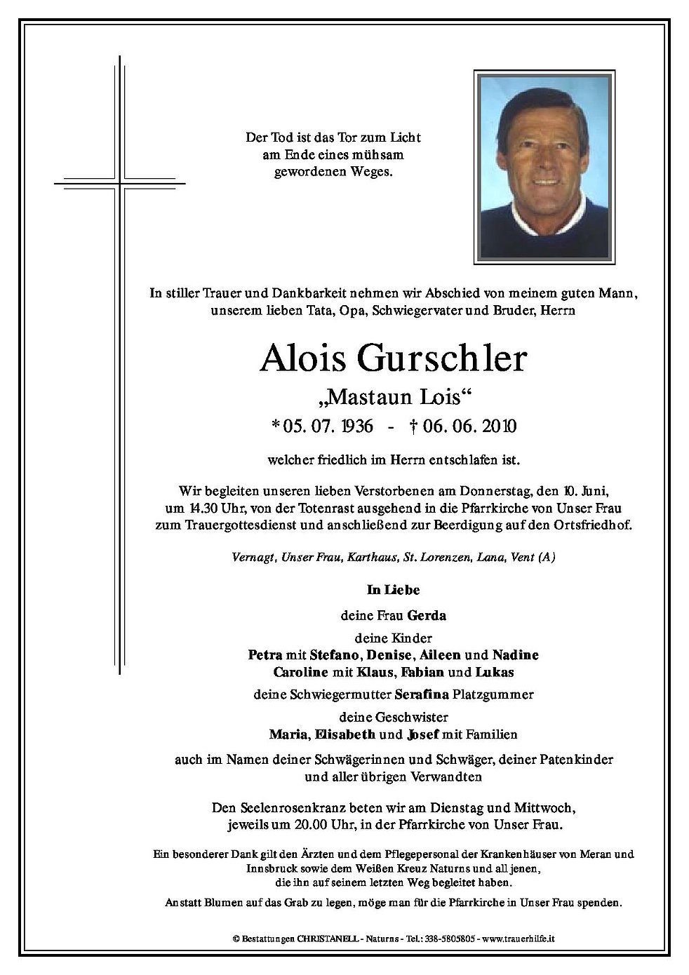 Ein besonderer Dank gilt den Ärzten und dem Pflegepersonal der Krankenhäuser von Meran und Innsbruck sowie dem Weißen Kreuz Naturns und all jenen, die ihn auf seinem letzten Weg begleitet haben.