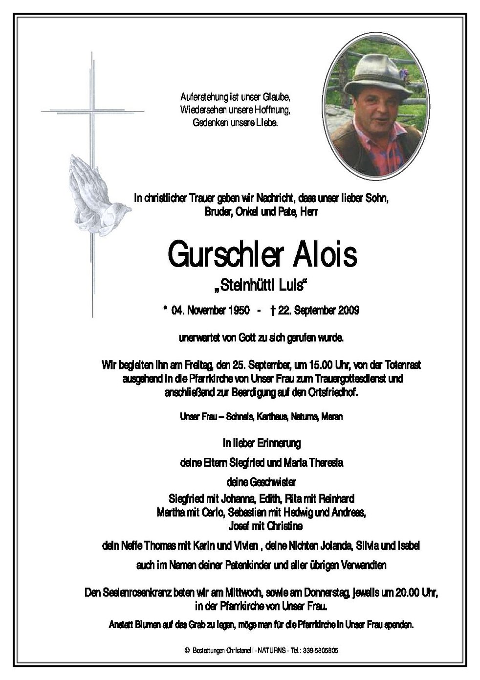 Anstatt Blumen auf das Grab zu legen, möge man für die Pfarrkirche in Unser Frau spenden.