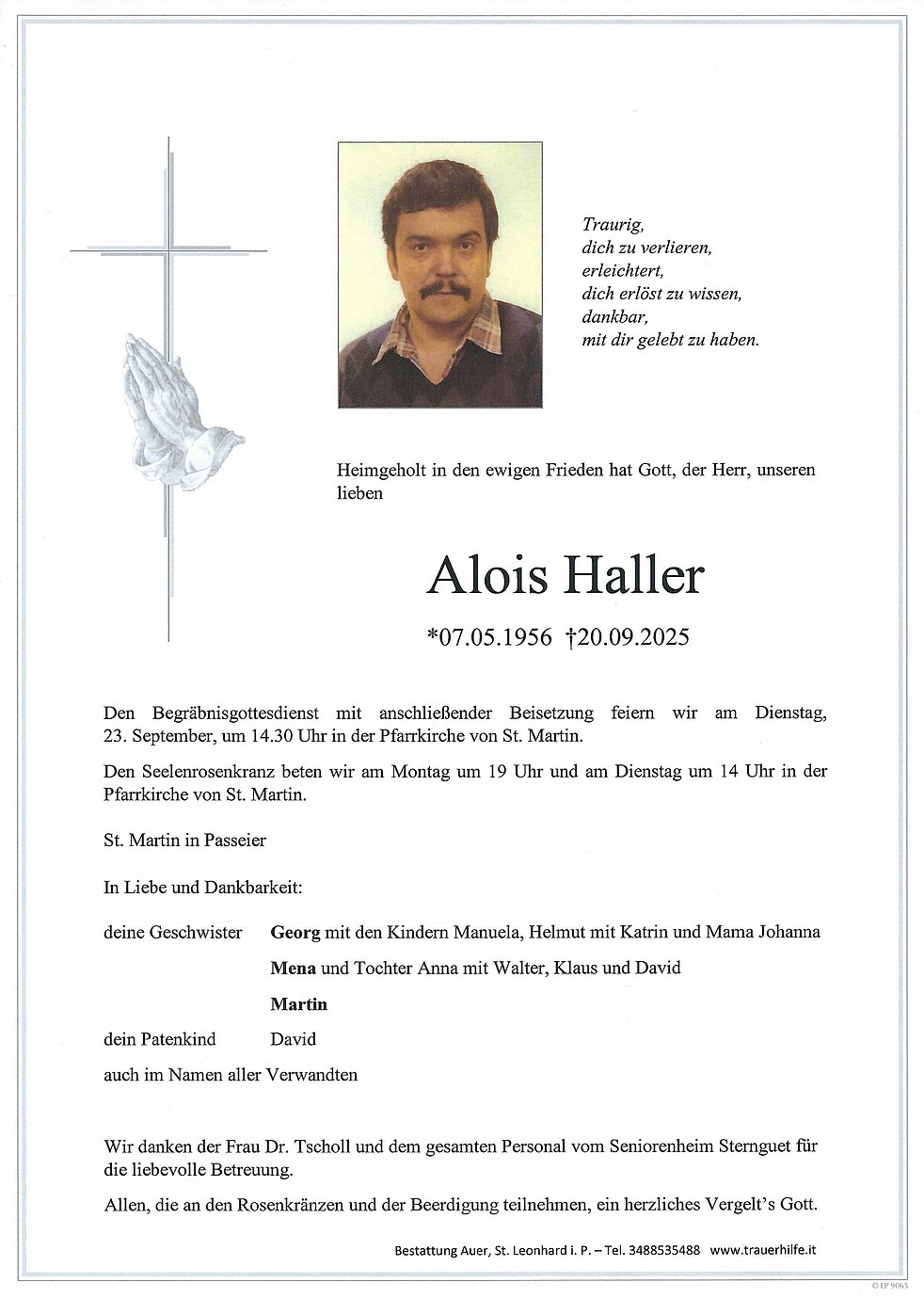 Begräbnisgottesdienst: 23.09. - 14:30 Uhr Pfarrkirche von St. Martin