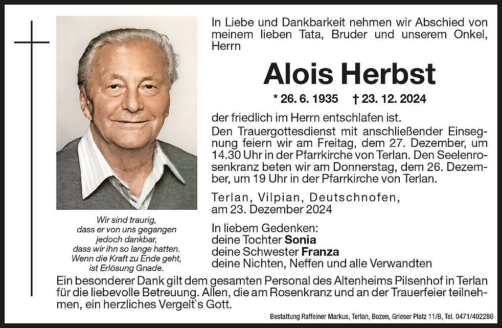 Den Trauergottesdienst mit anschließender Einsegnung feiern wir am Freitag, dem 27. Dezember, um 14.30 Uhr in der Pfarrkirche von Terlan.