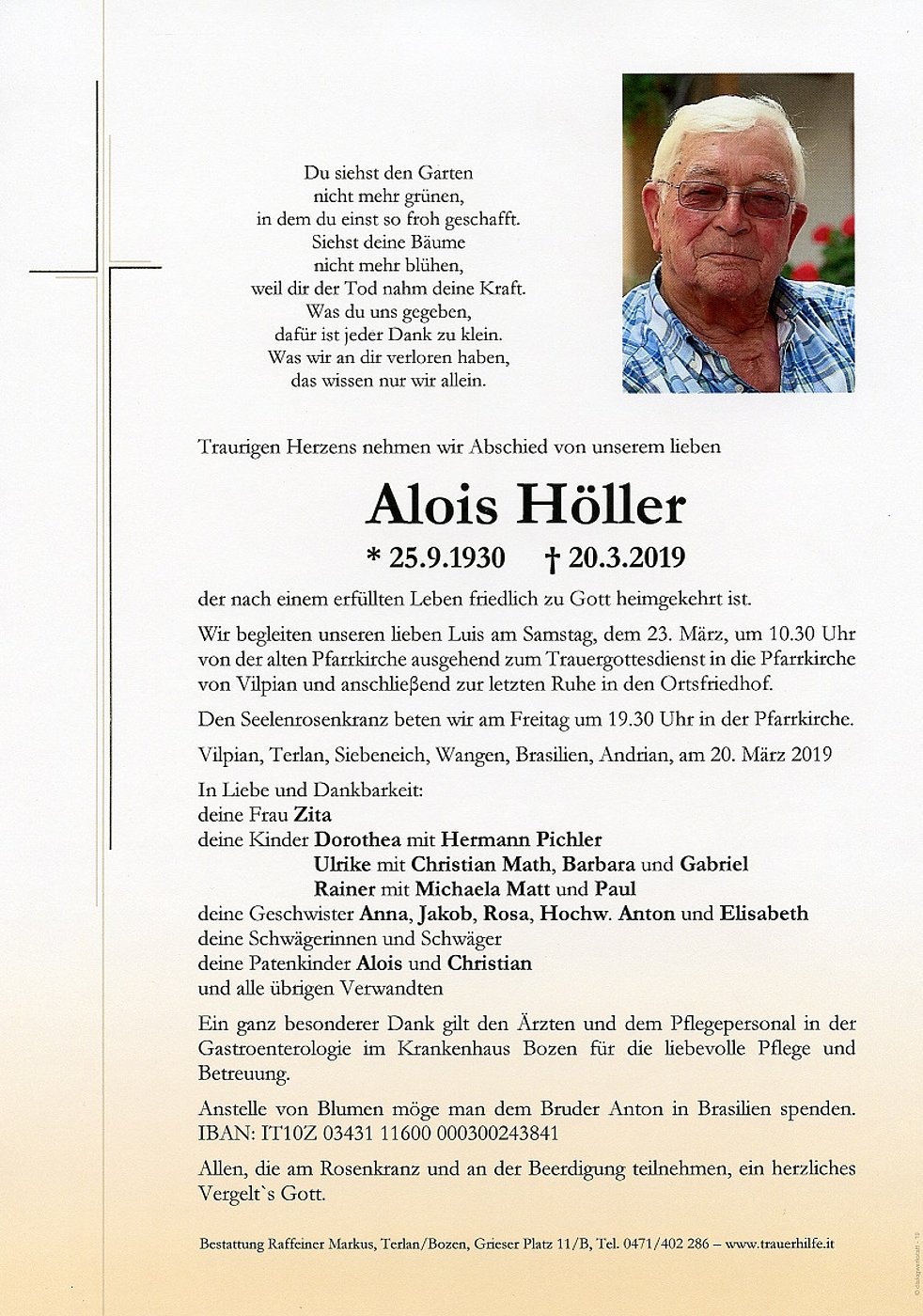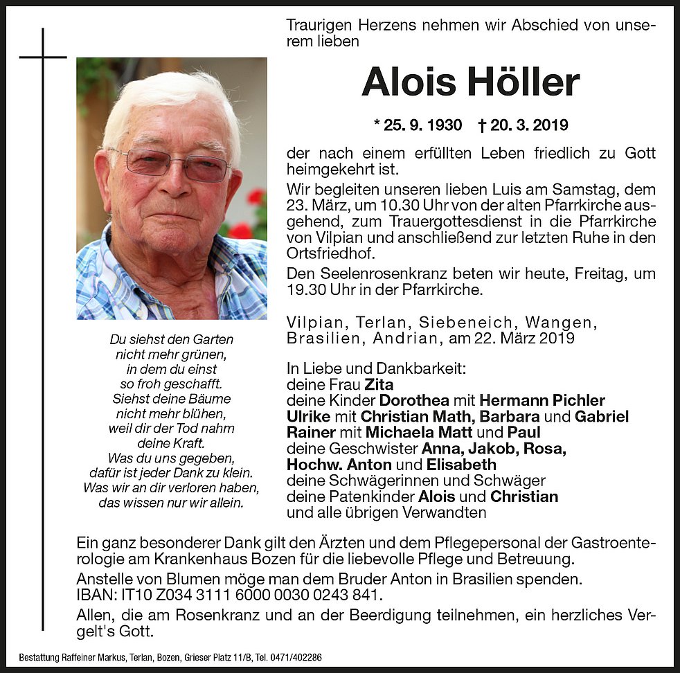 Anstelle von Blumen möge man dem Bruder Anton in Brasilien spenden. IBAN: IT10Z 03431 11600 000300243841
