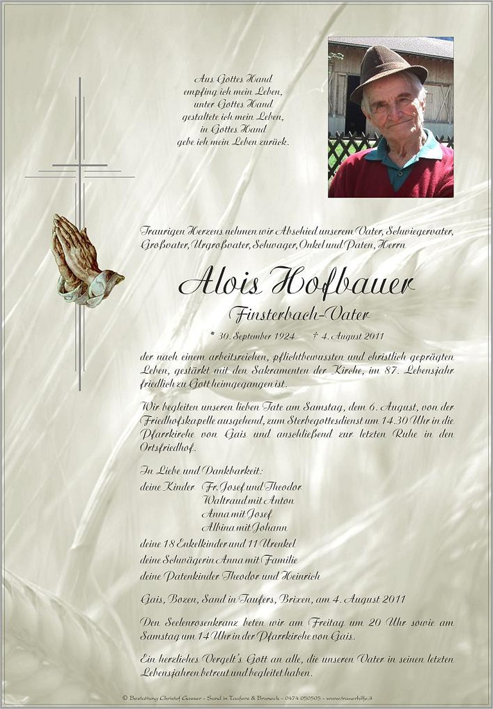Wir begleiten unseren lieben Tate am Samstag, dem 6. August, von der Friedhofskapelle ausgehend, zum Sterbegottesdienst um 14.30 Uhr in die Pfarrkirche von Gais und anschließend zur letzten Ruhe in den Ortsfriedhof.