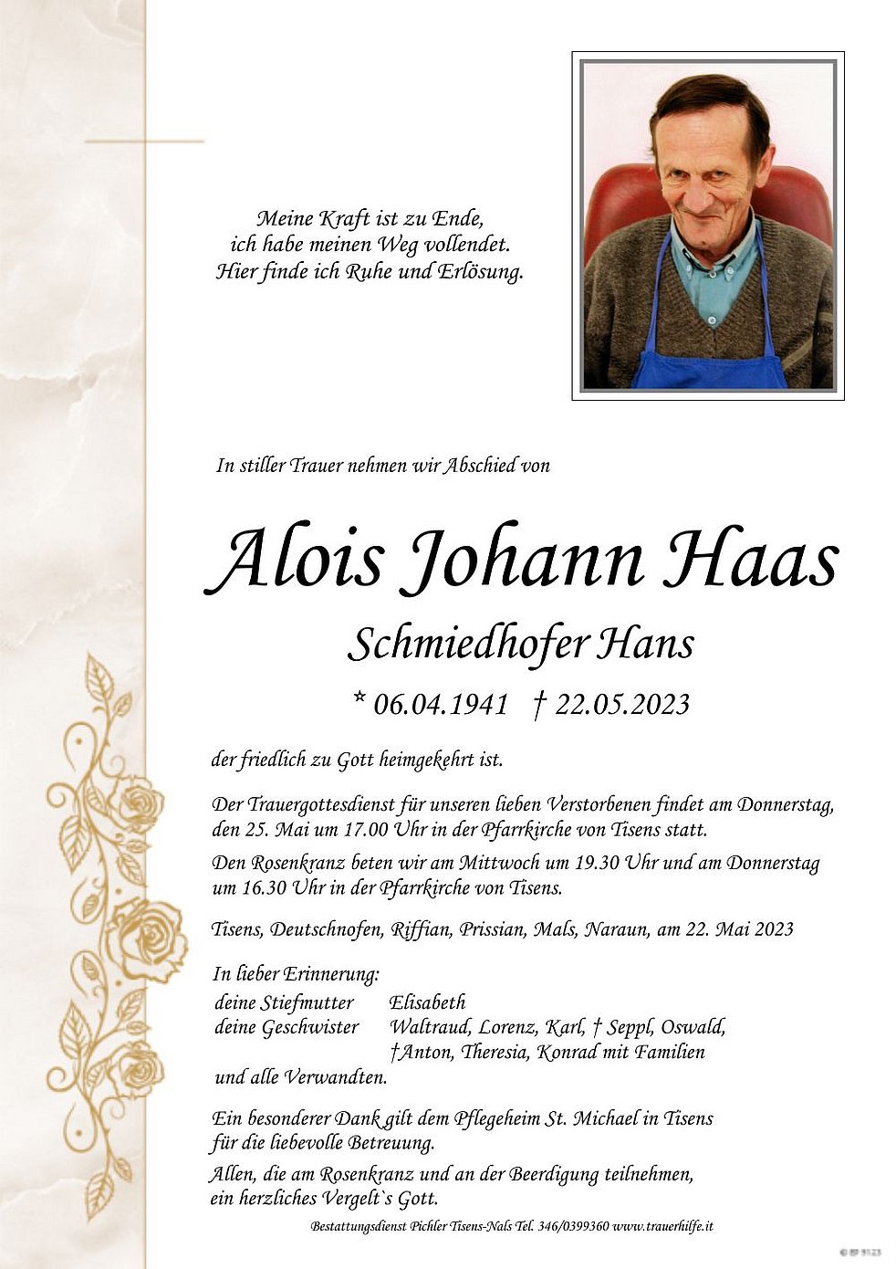 Begräbnisgottesdienst: 25.05. - 17:00 Uhr Pfarrkirche Tisens