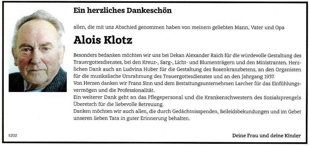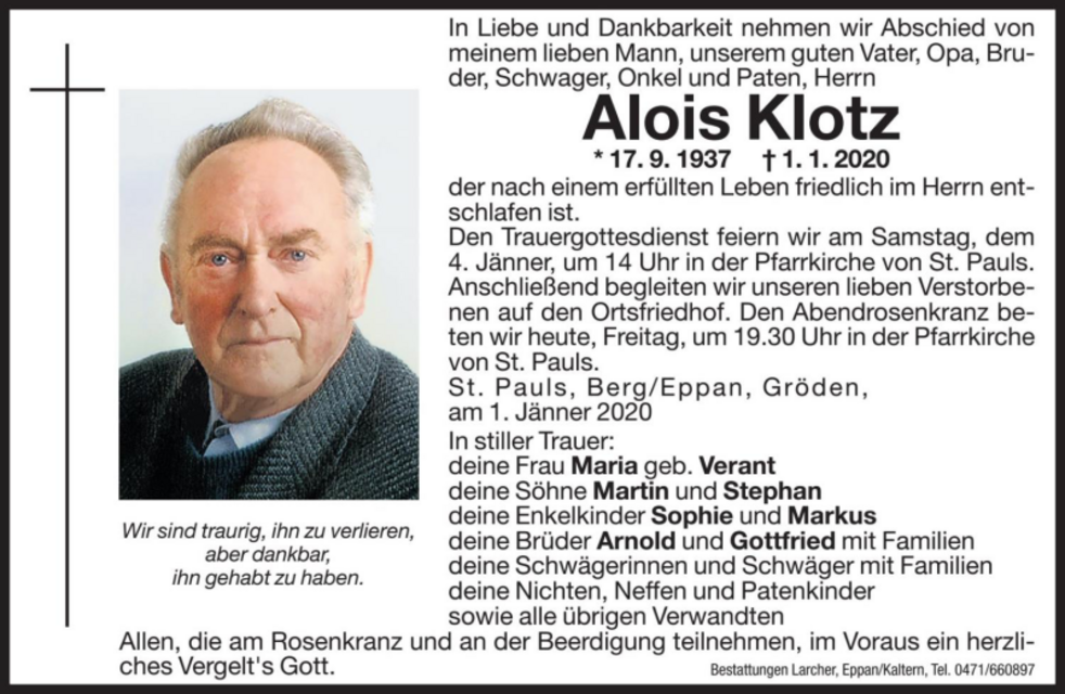 Den Trauergottesdienst feiern wir am Samstag, dem 4. Jänner um 14 Uhr in der Pfarrkirche von St. Pauls. Anschließend begleiten wir unseren lieben Verstorbenen auf den Ortsfriedhof. Den Abendrosenkranz beten wir am Freitag, um 19.30 Uhr in der Pfarrkirche von St. Pauls.
