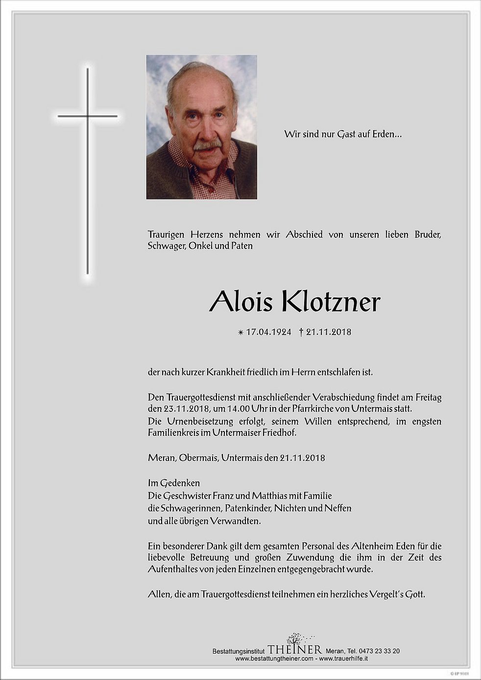 Den Trauergottesdienst mit anschließender Verabschiedung findet am Freitag den 23.11.2018, um 14.00 Uhr in der Pfarrkirche von Untermais statt. Die Urnenbeisetzung erfolgt, seinem Willen entsprechend, im engsten Familienkreis im Untermaiser Friedhof.