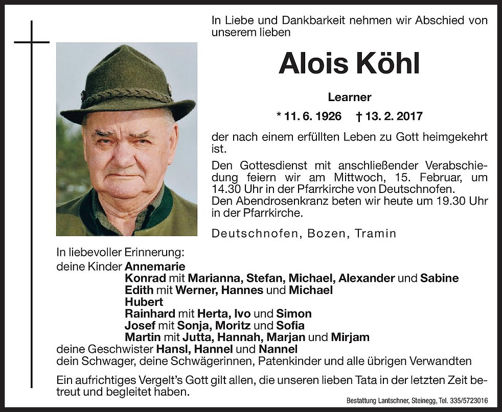 am Mittwoch, 15. Februar, um 14.30 Uhr in der Pfarrkirche von Deutschnofen.