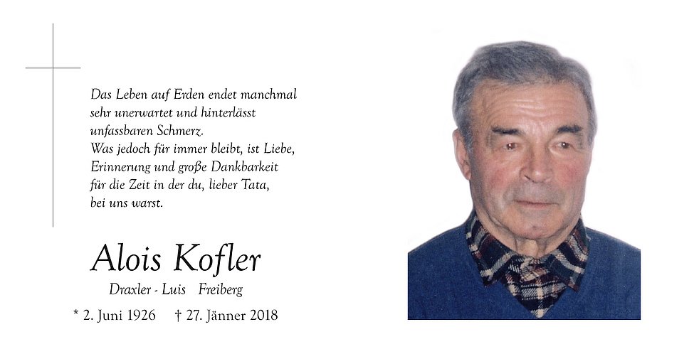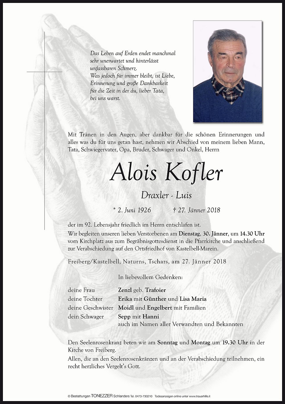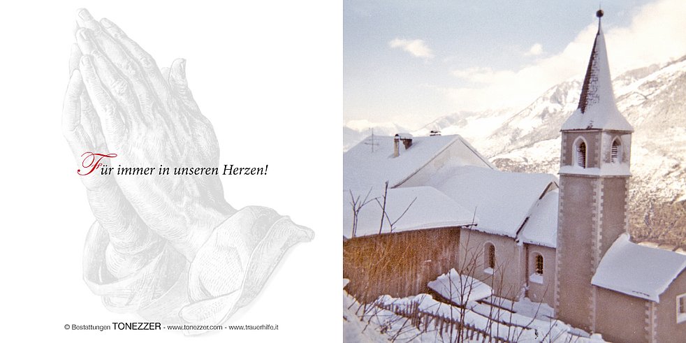 Wir begleiten unseren lieben Verstorbenen am Dienstag, 30. Jänner, um 14.30 Uhr vom Kirchplatz aus zum Begräbnisgottesdienst in die Pfarrkirche und anschließend zur Verabschiedung auf den Ortsfriedhof von Kastelbell-Marein.