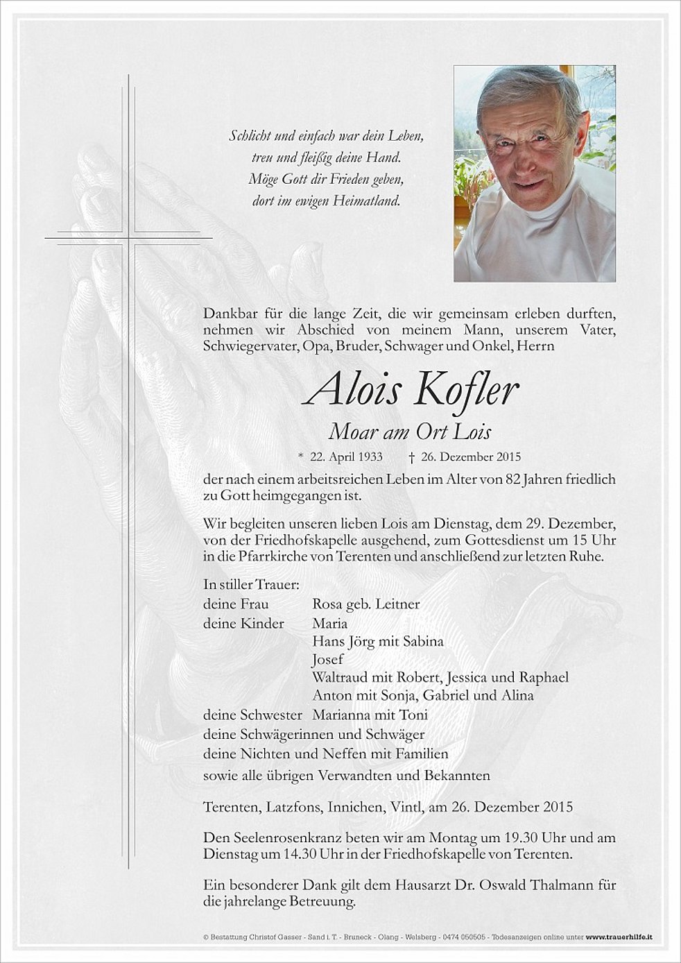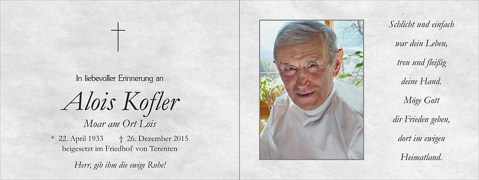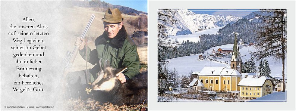 Wir begleiten unseren lieben Lois am Dienstag, dem 29. Dezember, von der Friedhofskapelle ausgehend, zum Gottesdienst um 15 Uhr in die Pfarrkirche von Terenten und anschließend zur letzten Ruhe.