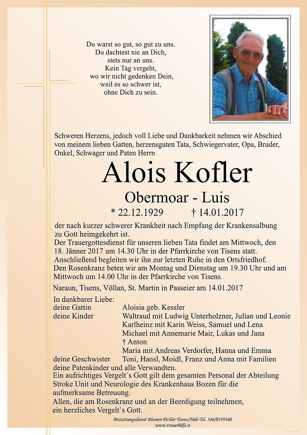 18. Jänner 2017 um 14.30 Uhr in der Pfarrkirche von Tisens statt.