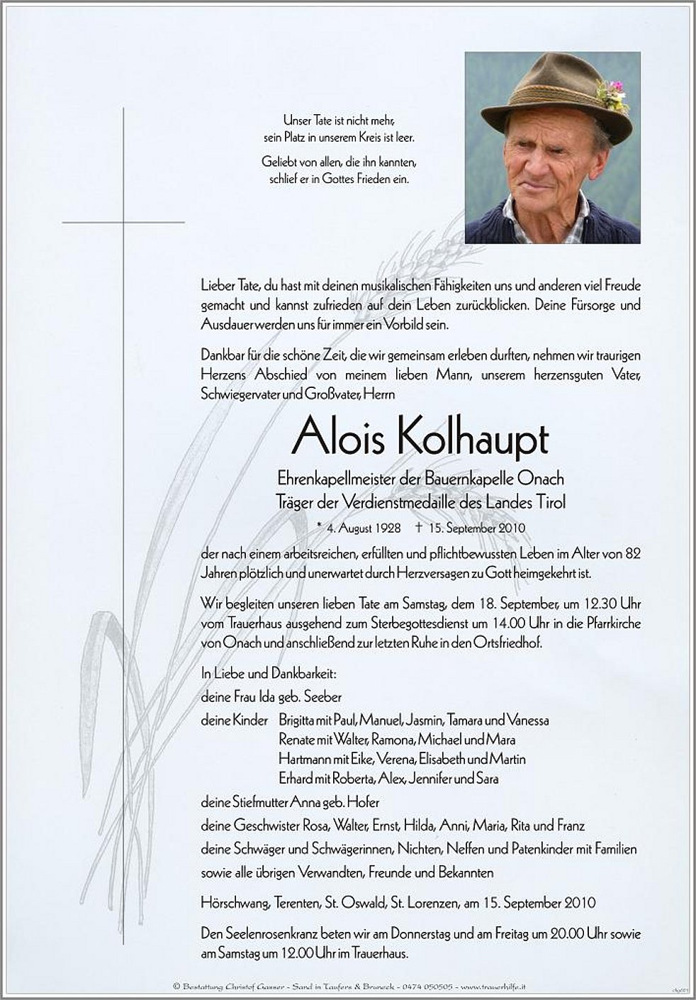 Wir begleiten unseren lieben Tate am Samstag, dem 18. September, um 12.30 Uhr vom Trauerhaus ausgehend zum Sterbegottesdienst um 14.00 Uhr in die Pfarrkirche von Onach und anschließend zur letzten Ruhe in den Ortsfriedhof.